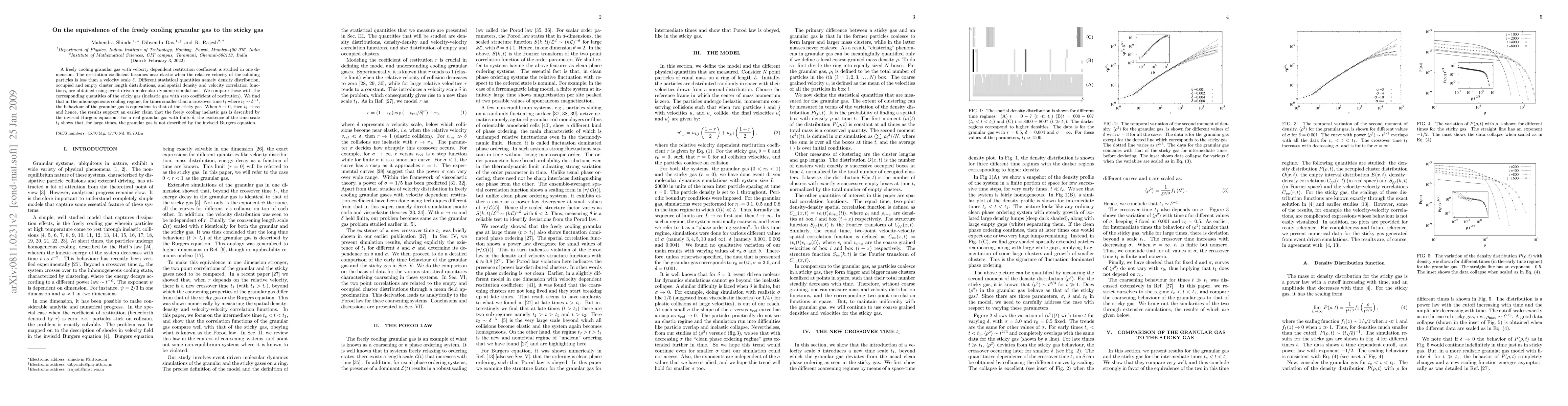 This study investigates the behavior of freely cooling granular gases using molecular dynamic simulations and finds that, in the inhomogeneous cooling regime, the granular gas exhibits equivalent behavior to sticky gas for times less than a crossover time $t_1 \sim \delta^{-1}$. For small $\delta$, the granular gas is described by the inviscid Burgers equation for short times, but not for larger times.