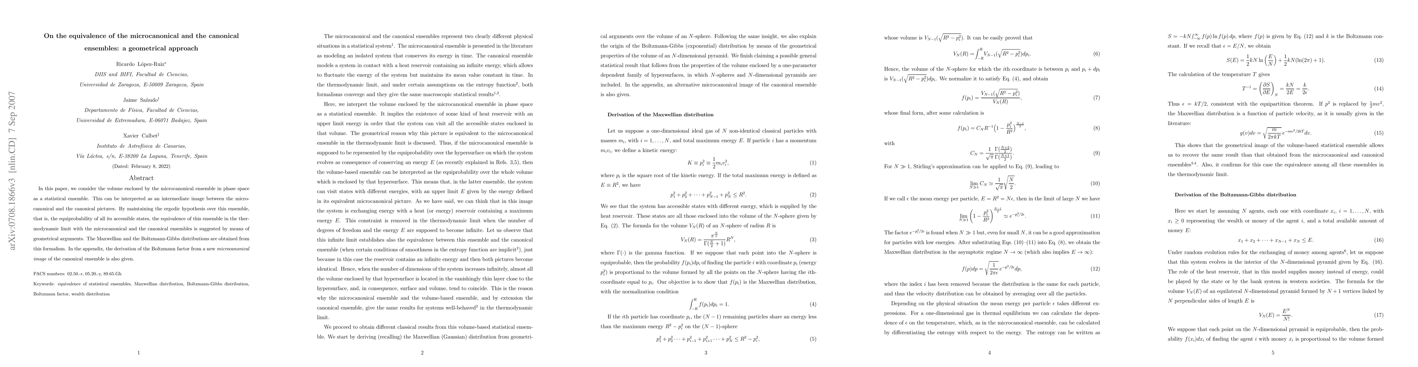 This paper explores the equivalence of the microcanonical and canonical ensembles using a geometrical approach, proposing an intermediate ensemble in phase space that maintains ergodicity and derives the Maxwellian and Boltzmann-Gibbs distributions, with an appendix providing a new derivation of the Boltzmann factor.