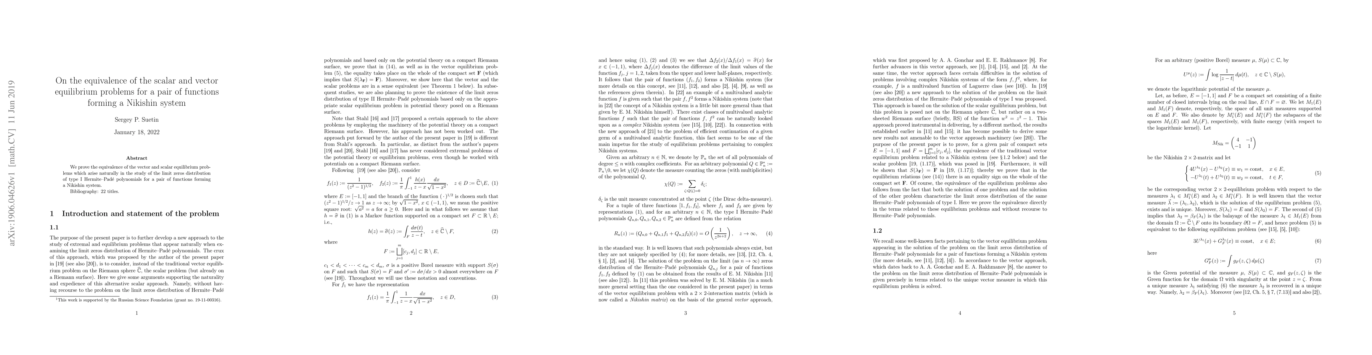 Researchers prove equivalence between scalar and vector equilibrium problems for a pair of functions forming a Nikishin system, with implications for studying limit zeros distribution of type I Hermite-Padé polynomials.