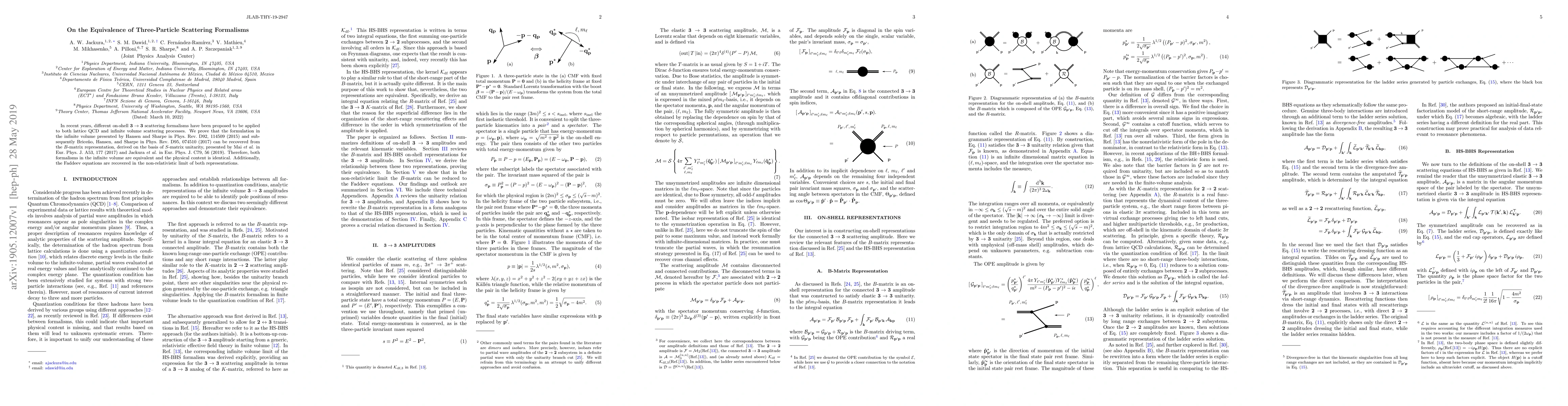 In recent years, different on-shell $\mathbf{3}\to\mathbf{3}$ scattering formalisms have been proposed to be applied to both lattice QCD and infinite volume scattering processes. We prove that the formulation in the infinite volume presented by Hansen and Sharpe in Phys.~Rev.~D92, 114509 (2015) and subsequently Brice\~no, Hansen, and Sharpe in Phys.~Rev.~D95, 074510 (2017) can be recovered from the $B$-matrix representation, derived on the basis of $S$-matrix unitarity, presented by Mai {\em et al.} in Eur.~Phys.~J.~A53, 177 (2017) and Jackura {\em et al.} in Eur.~Phys.~J.~C79, 56 (2019). Therefore, both formalisms in the infinite volume are equivalent and the physical content is identical. Additionally, the Faddeev equations are recovered in the non-relativistic limit of both representations.