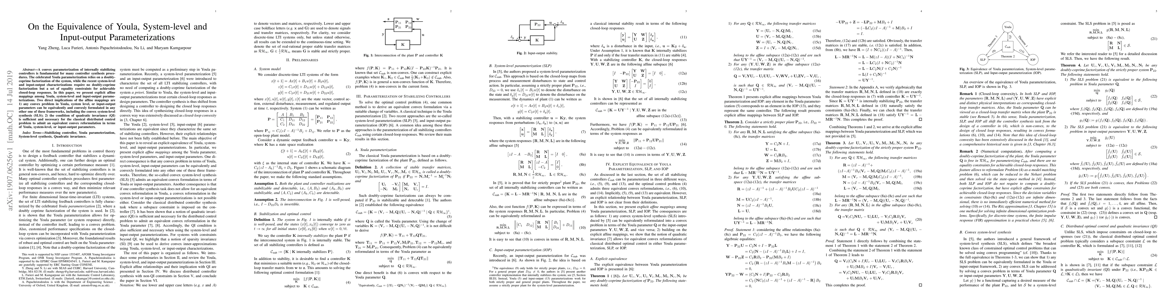 A convex parameterization of internally stabilizing controllers is fundamental for many controller synthesis procedures. The celebrated Youla parameterization relies on a doubly-coprime factorization of the system, while the recent system-level and input-output characterizations require no doubly-coprime factorization but a set of equality constraints for achievable closed-loop responses. In this paper, we present explicit affine mappings among Youla, system-level and input-output parameterizations. Two direct implications of the affine mappings are 1) any convex problem in Youla, system level, or input-output parameters can be equivalently and convexly formulated in any other one of these frameworks, including the convex system-level synthesis (SLS); 2) the condition of quadratic invariance (QI) is sufficient and necessary for the classical distributed control problem to admit an equivalent convex reformulation in terms of Youla, system-level, or input-output parameters.