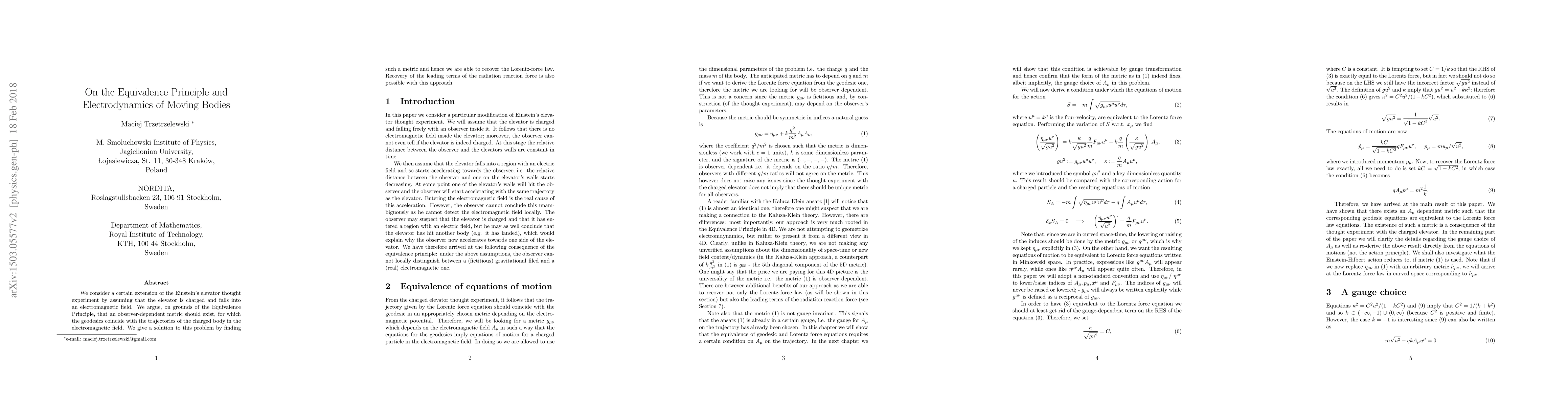 We consider a certain extension of the Einstein's elevator thought experiment by assuming that the elevator is charged and falls into an electromagnetic field. We argue, on grounds of the Equivalence Principle, that an observer-dependent metric should exist, for which the geodesics coincide with the trajectories of the charged body in the electromagnetic field. We give a solution to this problem by finding such a metric and hence we are able to recover the Lorentz-force law. Recovery of the leading terms of the radiation reaction force is also possible with this approach.
