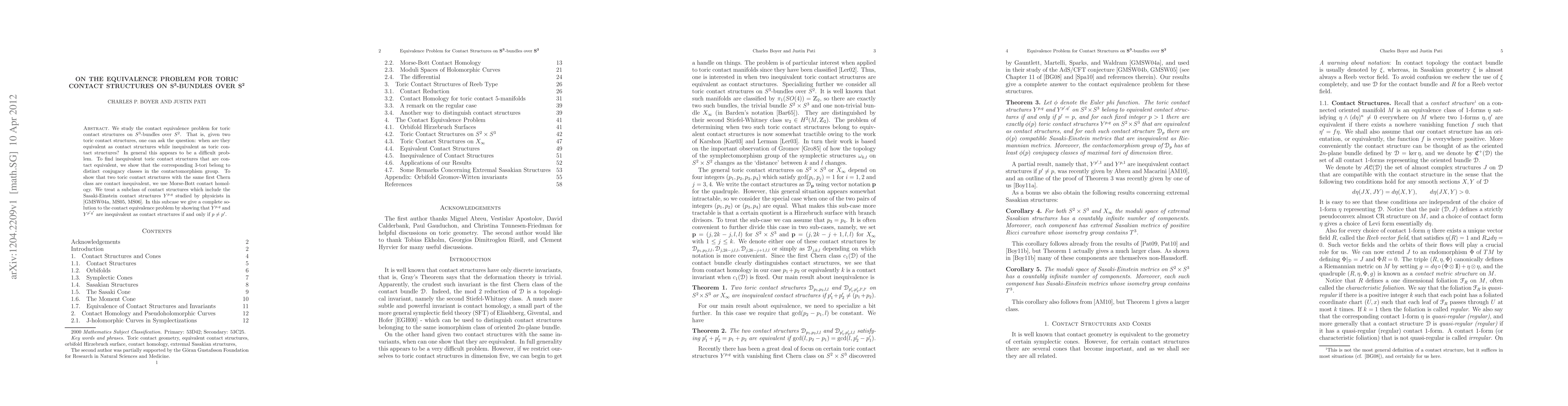 We study the contact equivalence problem for toric contact structures on $S^3$-bundles over $S^2$. That is, given two toric contact structures, one can ask the question: when are they equivalent as contact structures while inequivalent as toric contact structures? In general this appears to be a difficult problem. To find inequivalent toric contact structures that are contact equivalent, we show that the corresponding 3-tori belong to distinct conjugacy classes in the contactomorphism group. To show that two toric contact structures with the same first Chern class are contact inequivalent, we use Morse-Bott contact homology. We treat a subclass of contact structures which include the Sasaki-Einstein contact structures $Y^{p,q}$ studied by physicists. In this subcase we give a complete solution to the contact equivalence problem by showing that $Y^{p,q}$ and $Y^{p'q'}$ are inequivalent as contact structures if and only if $p\neq p'$.