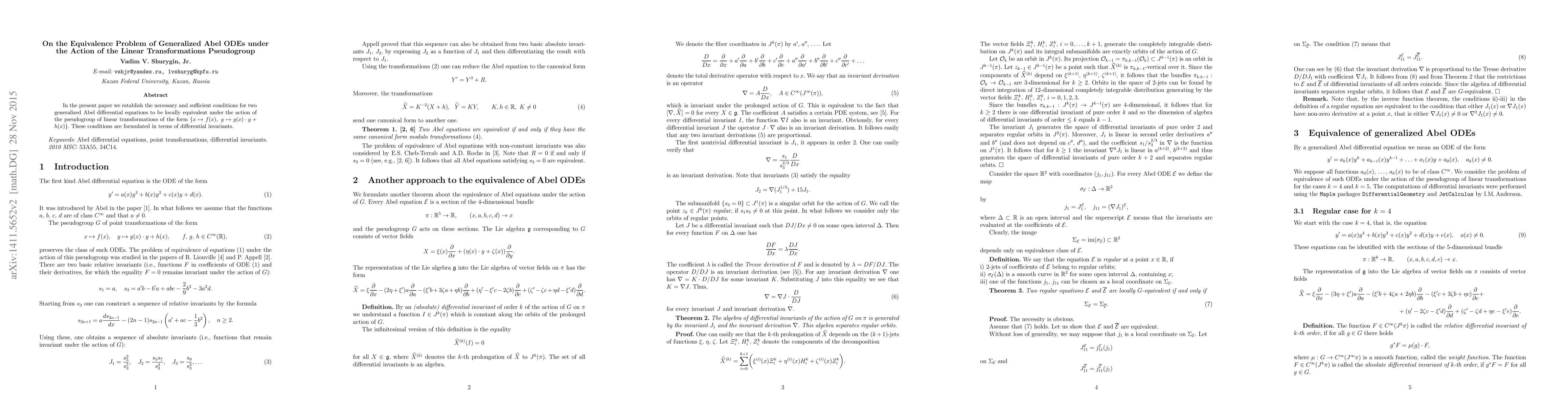 In the present paper we establish the necessary and sufficient conditions for two generalized Abel differential equations to be locally equivalent under the action of the pseudogroup of linear transformations of the form $\{x\mapsto f(x),~ y\mapsto g(x)\cdot y + h(x)\}$. These conditions are formulated in terms of differential invariants.