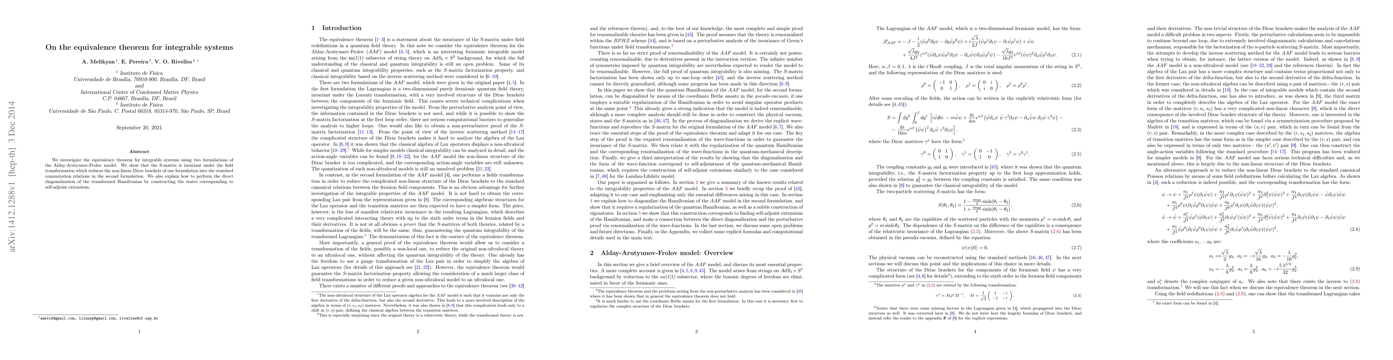We investigate the equivalence theorem for integrable systems using two formulations of the Alday-Arutyunov-Frolov model. We show that the S-matrix is invariant under the field transformation which reduces the non-linear Dirac brackets of one formulation into the standard commutation relations in the second formulation. We also explain how to perform the direct diagonalization of the transformed Hamiltonian by constructing the states corresponding to self-adjoint extensions.