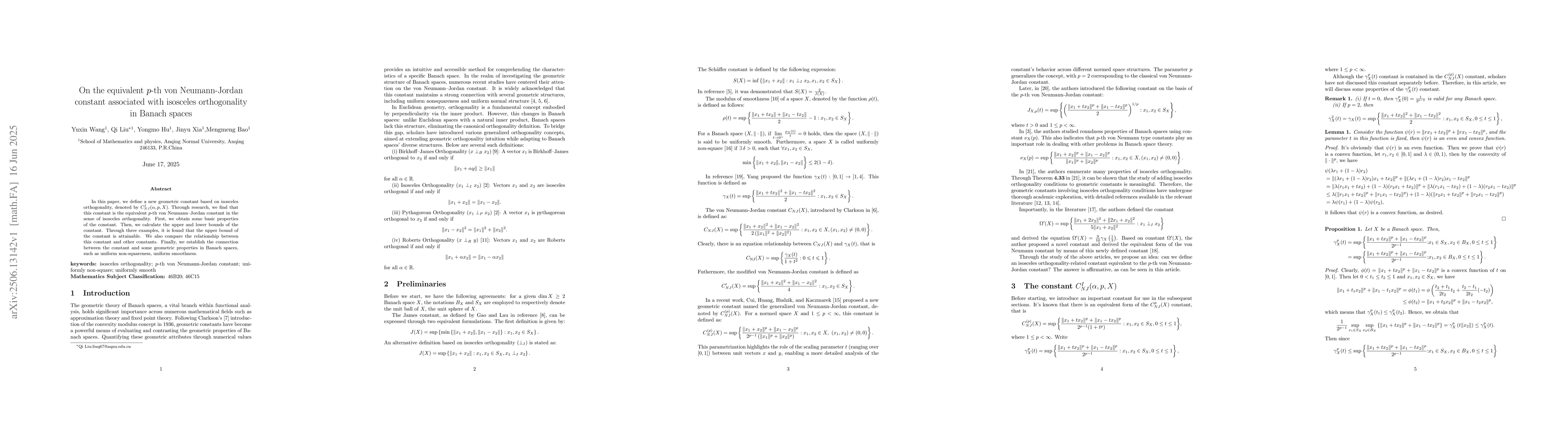 In this paper, we define a new geometric constant based on isosceles orthogonality, denoted by . Through research, we find that this constant is the equivalent p-th von Neumann Jordan constant in the sense of isosceles orthogonality. First, we obtain some basic properties of the constant. Then, we calculate the upper and lower bounds of the constant. Through three examples, it is found that the upper bound of the constant is attainable. We also compare the relationship between this constant and other constants. Finally, we establish the connection between the constant and some geometric properties in Banach spaces, such as uniform non-squareness, uniform smoothness.