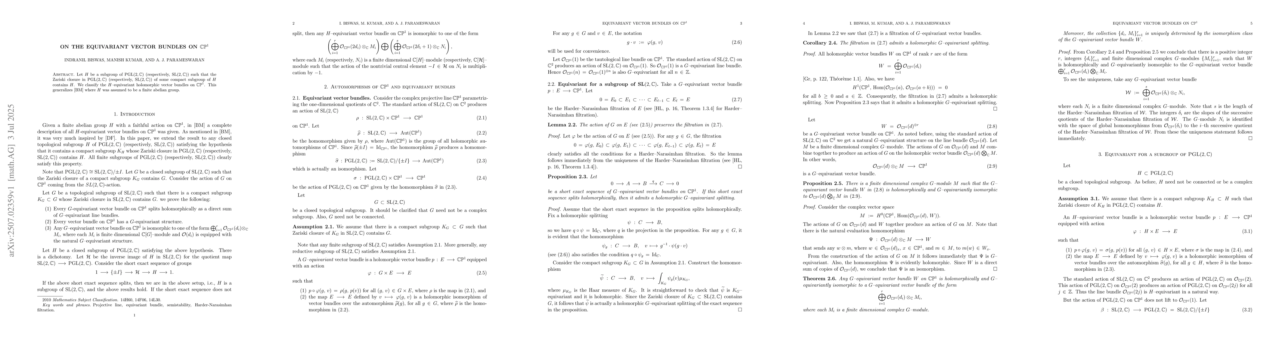 Let $H$ be a subgroup of ${\rm PGL}(2,\mathbb C)$ (respectively, ${\rm SL}(2,\mathbb C)$) such that the Zariski closure in ${\rm PGL}(2,\mathbb C)$ (respectively, ${\rm SL}(2,\mathbb C)$) of some compact subgroup of $H$ contains $H$. We classify the $H$--equivariant holomorphic vector bundles on $\mathbb{CP}^1$. This generalizes \cite{BM} where $H$ was assumed to be a finite abelian group.