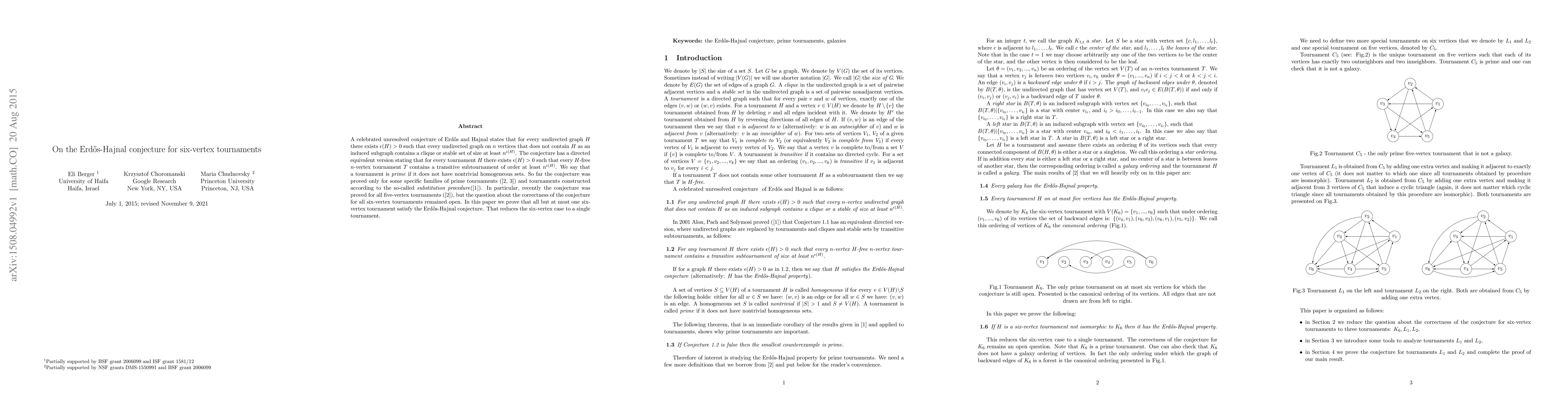 This paper proves that all but one six-vertex tournament satisfies the Erdős-Hajnal conjecture, significantly narrowing the cases where the conjecture remains unproven to just one specific six-vertex tournament. This advances the understanding of the conjecture's validity in directed structures.