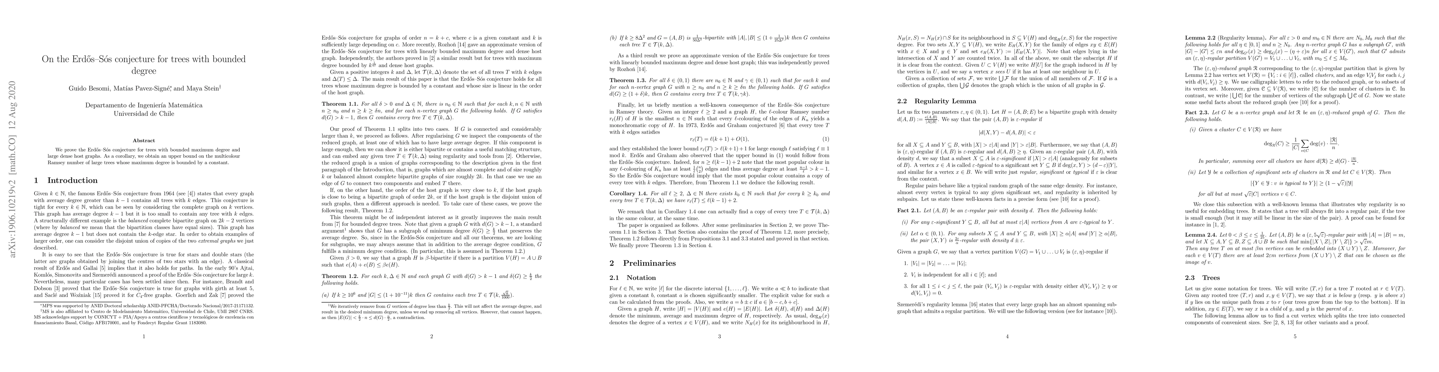 The paper proves the Erdős-Sós conjecture for trees with bounded maximum degree and large dense host graphs, and derives an upper bound on the multicolour Ramsey number for such trees.