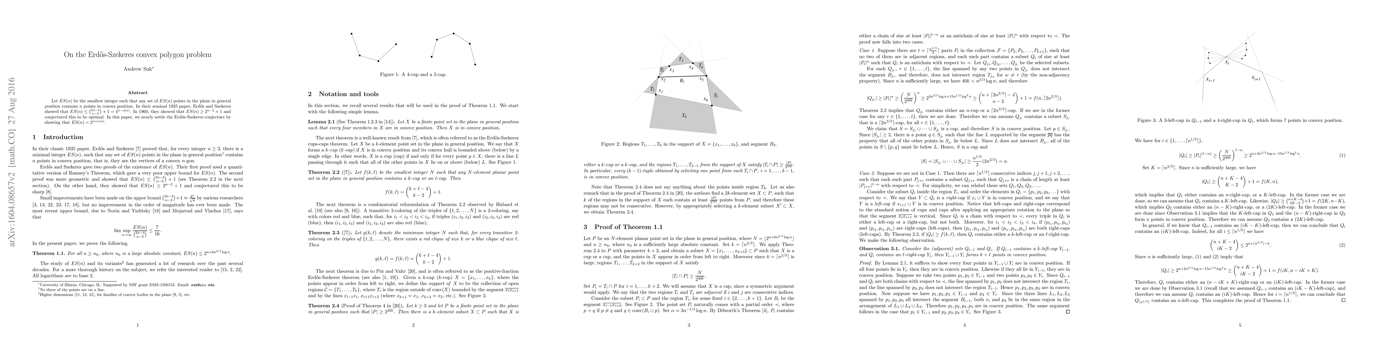 Let $ES(n)$ be the smallest integer such that any set of $ES(n)$ points in the plane in general position contains $n$ points in convex position. In their seminal 1935 paper, Erdos and Szekeres showed that $ES(n) \leq {2n - 4\choose n-2} + 1 = 4^{n -o(n)}$. In 1960, they showed that $ES(n) \geq 2^{n-2} + 1$ and conjectured this to be optimal. In this paper, we nearly settle the Erdos-Szekeres conjecture by showing that $ES(n) =2^{n +o(n)}$.