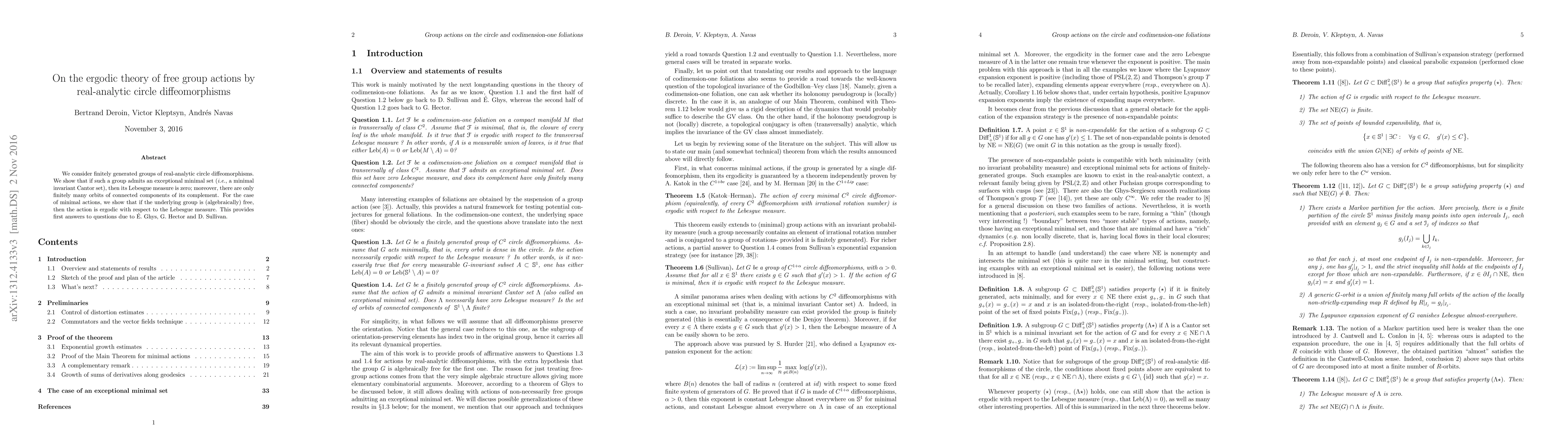 This paper investigates the ergodic theory of free group actions by real-analytic circle diffeomorphisms, proving that groups with exceptional minimal sets have Lebesgue measure zero and finitely many orbits. It also establishes ergodicity for free group actions in minimal cases.