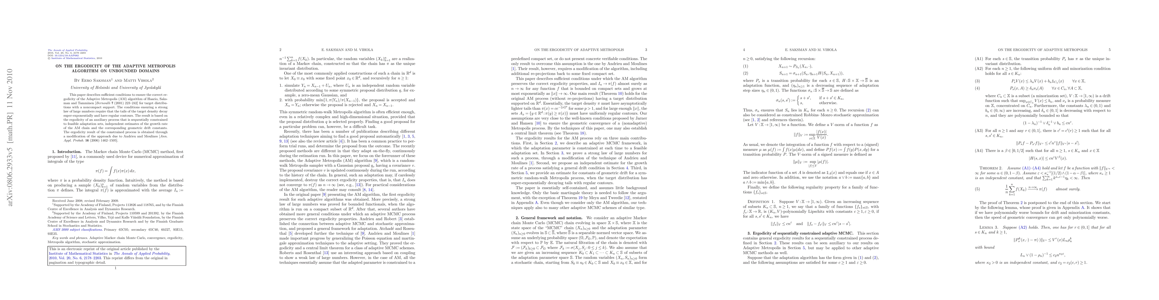 This paper describes sufficient conditions to ensure the correct ergodicity of the Adaptive Metropolis (AM) algorithm of Haario, Saksman and Tamminen [Bernoulli 7 (2001) 223--242] for target distributions with a noncompact support. The conditions ensuring a strong law of large numbers require that the tails of the target density decay super-exponentially and have regular contours. The result is based on the ergodicity of an auxiliary process that is sequentially constrained to feasible adaptation sets, independent estimates of the growth rate of the AM chain and the corresponding geometric drift constants. The ergodicity result of the constrained process is obtained through a modification of the approach due to Andrieu and Moulines [Ann. Appl. Probab. 16 (2006) 1462--1505].