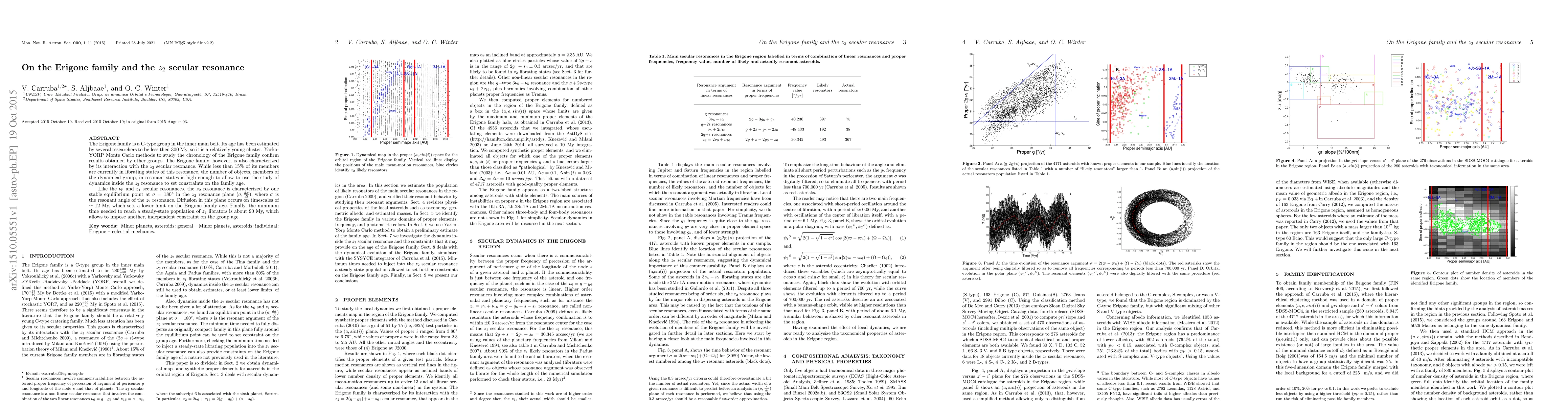 The Erigone family is a C-type group in the inner main belt. Its age has been estimated by several researchers to be less then 300 My, so it is a relatively young cluster. Yarko-YORP Monte Carlo methods to study the chronology of the Erigone family confirm results obtained by other groups. The Erigone family, however, is also characterized by its interaction with the $z_2$ secular resonance. While less than 15% of its members are currently in librating states of this resonance, the number of objects, members of the dynamical group, in resonant states is high enough to allow to use the study of dynamics inside the $z_2$ resonance to set constraints on the family age. Like the ${\nu}_{6}$ and $z_1$ secular resonances, the $z_2$ resonance is characterized by one stable equilibrium point at $\sigma = 180^{\circ}$ in the $z_2$ resonance plane $(\sigma, \frac{d\sigma}{dt})$, where $\sigma$ is the resonant angle of the $z_2$ resonance. Diffusion in this plane occurs on timescales of $\simeq 12$ My, which sets a lower limit on the Erigone family age. Finally, the minimum time needed to reach a steady-state population of $z_2$ librators is about 90 My, which allows to impose another, independent constraint on the group age.