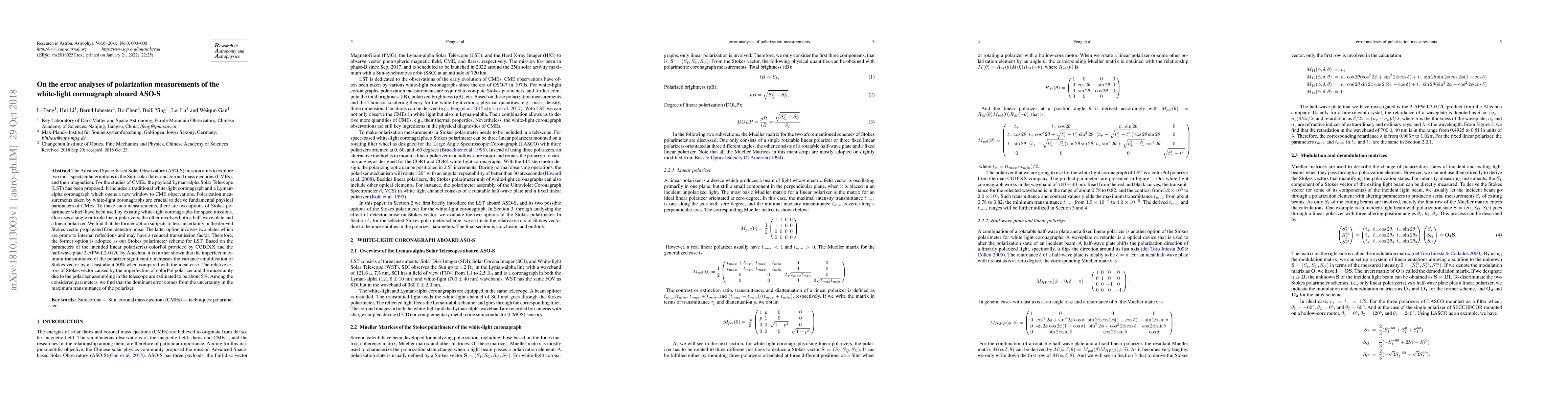 The Advanced Space-based Solar Observatory (ASO-S) mission aims to explore two most spectacular eruptions in the Sun: solar flares and coronal mass ejections (CMEs), and their magnetism. For the studies of CMEs, the payload Lyman-alpha Solar Telescope (LST) has been proposed. It includes a traditional white-light coronagraph and a Lyman-alpha coronagraph which opens a new window to CME observations. Polarization measurements taken by white-light coronagraphs are crucial to derive fundamental physical parameters of CMEs. To make such measurements, there are two options of Stokes polarimeter which have been used by existing white-light coronagraphs for space missions. One uses a single or triple linear polarizers, the other involves both a half-wave plate and a linear polarizer. We find that the former option subjects to less uncertainty in the derived Stokes vector propagated from detector noise. The latter option involves two plates which are prone to internal reflections and may have a reduced transmission factor. Therefore, the former option is adopted as our Stokes polarimeter scheme for LST. Based on the parameters of the intended linear polarizer(s) colorPol provided by CODIXX and the half-wave plate 2-APW-L2-012C by Altechna, it is further shown that the imperfect maximum transmittance of the polarizer significantly increases the variance amplification of Stokes vector by at least about 50% when compared with the ideal case. The relative errors of Stokes vector caused by the imperfection of colorPol polarizer and the uncertainty due to the polarizer assembling in the telescope are estimated to be about 5%. Among the considered parameters, we find that the dominant error comes from the uncertainty in the maximum transmittance of the polarizer.