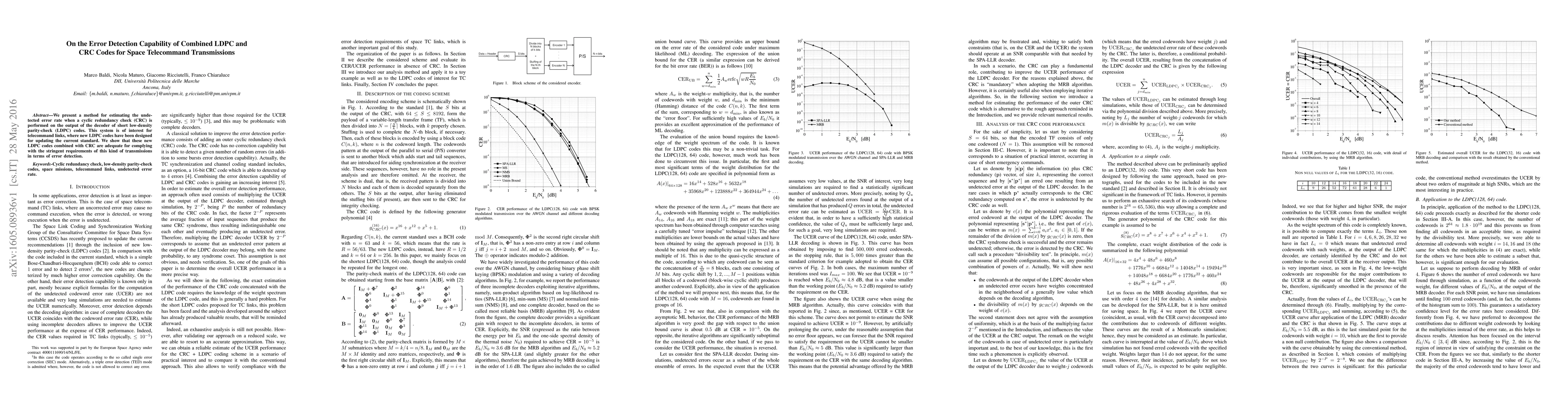 This paper estimates the undetected error rate for combined LDPC and CRC codes in space telecommand transmissions, demonstrating their adequacy for meeting stringent error detection requirements. The study highlights the effectiveness of new LDPC codes when paired with CRC for reliable telecommand links.