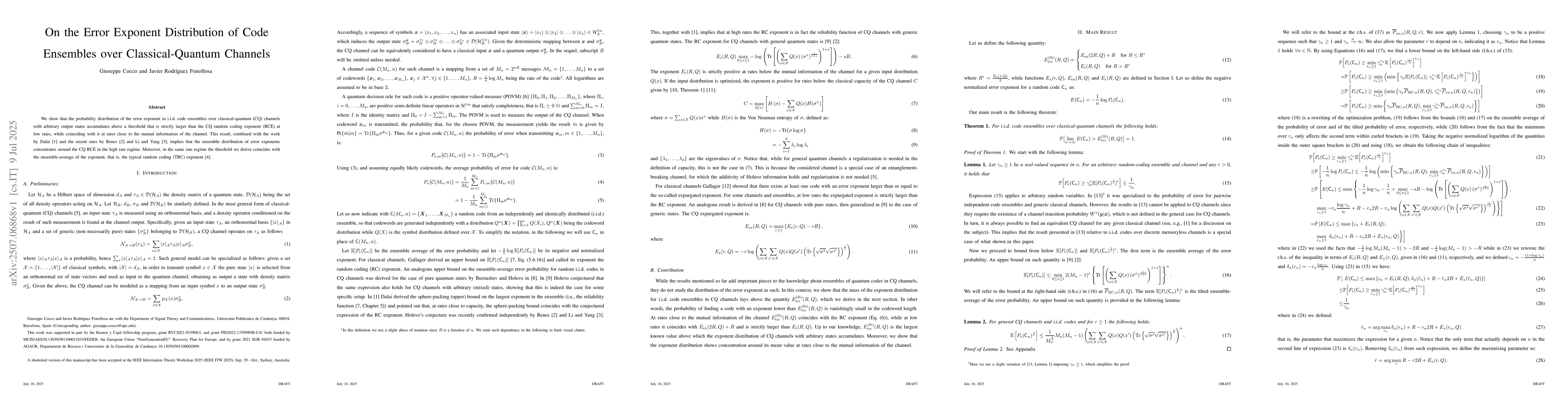 We show that the probability distribution of the error exponent in i.i.d. code ensembles over classical-quantum (CQ) channels with arbitrary output states accumulates above a threshold that is strictly larger than the CQ random coding exponent (RCE) at low rates, while coinciding with it at rates close to the mutual information of the channel. This result, combined with the work by Dalai [1] and the recent ones by Renes [2] and Li and Yang [3], implies that the ensemble distribution of error exponents concentrates around the CQ RCE in the high rate regime. Moreover, in the same rate regime the threshold we derive coincides with the ensemble-average of the exponent, that is, the typical random coding (TRC) exponent [4].