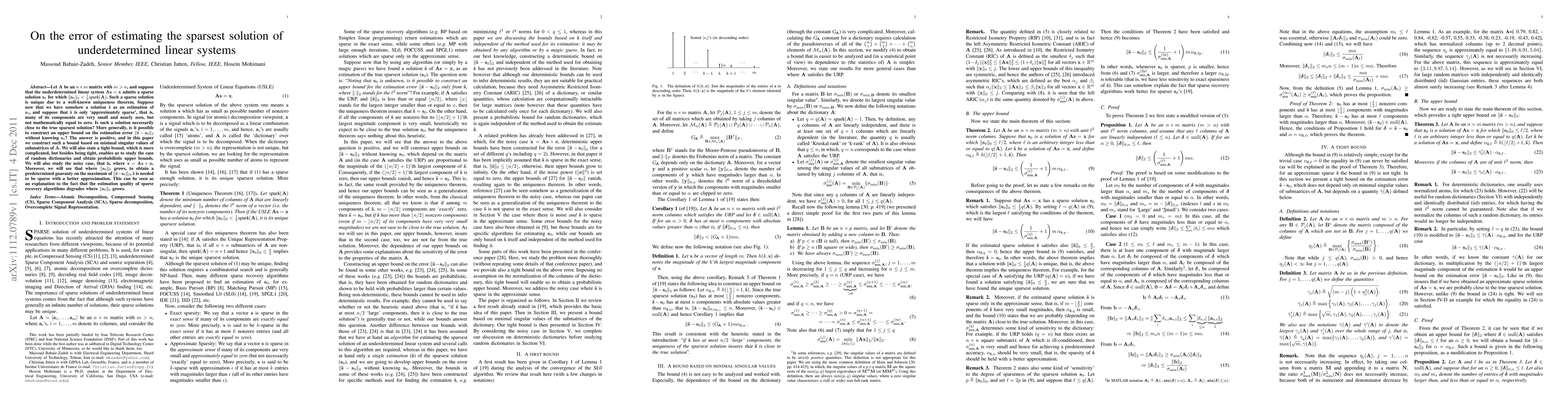 This paper investigates how accurately an approximate sparse solution can represent the true sparsest solution of an underdetermined linear system, finding that it is possible to construct an upper bound on estimation error based on minimal singular values of submatrices of A.