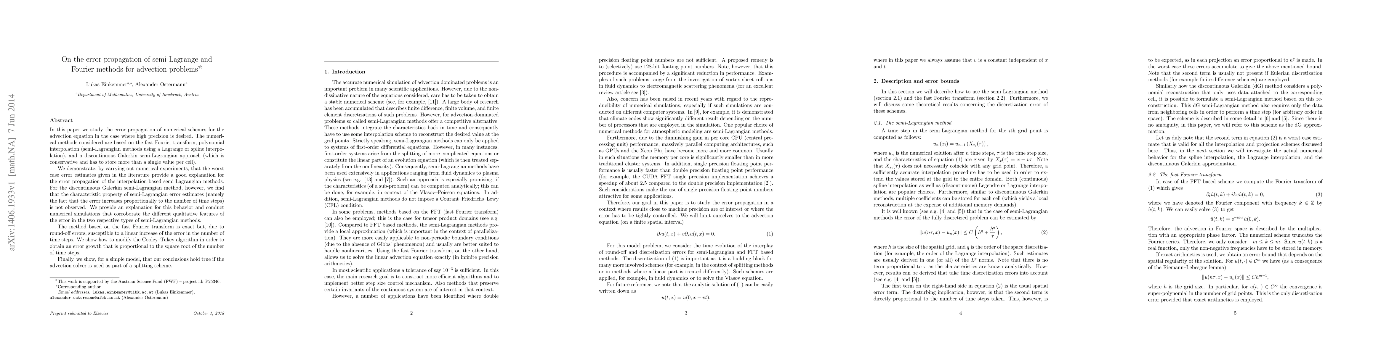 This paper investigates the error propagation in numerical schemes for the advection equation, comparing semi-Lagrange and Fourier methods. It finds that interpolation-based semi-Lagrangian methods follow traditional error estimates, while the discontinuous Galerkin approach does not. The Fourier method is exact but prone to round-off errors, which can be mitigated by modifying the Cooley-Tukey algorithm.