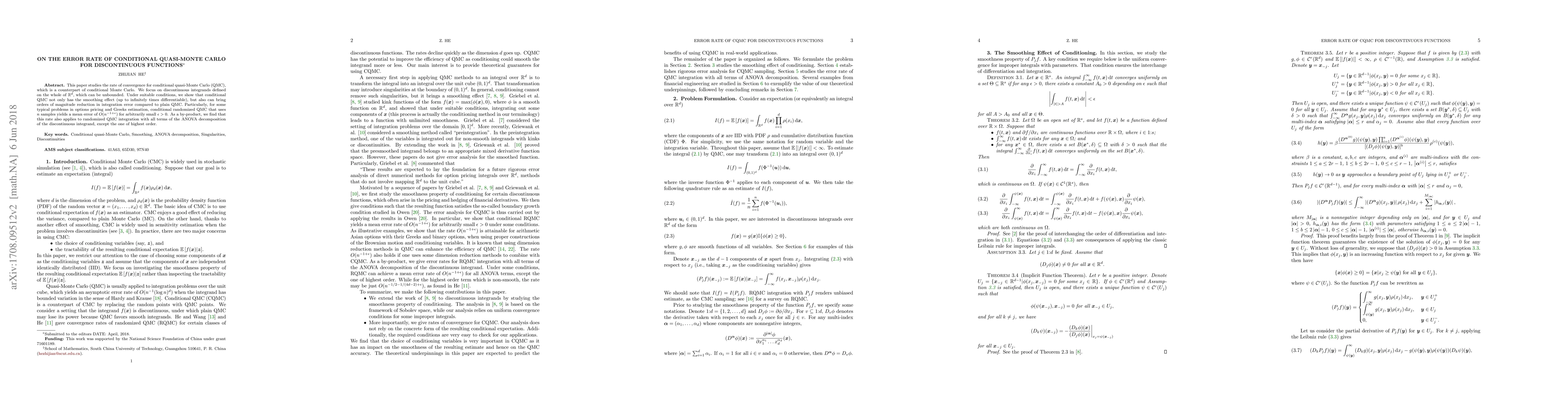 This paper investigates the convergence rate of conditional quasi-Monte Carlo (QMC) for discontinuous functions, demonstrating significant error reduction compared to plain QMC, and achieving an error rate of $O(n^{-1+\epsilon})$ for options pricing and Greeks estimation. The findings also extend to the ANOVA decomposition of the integrand.