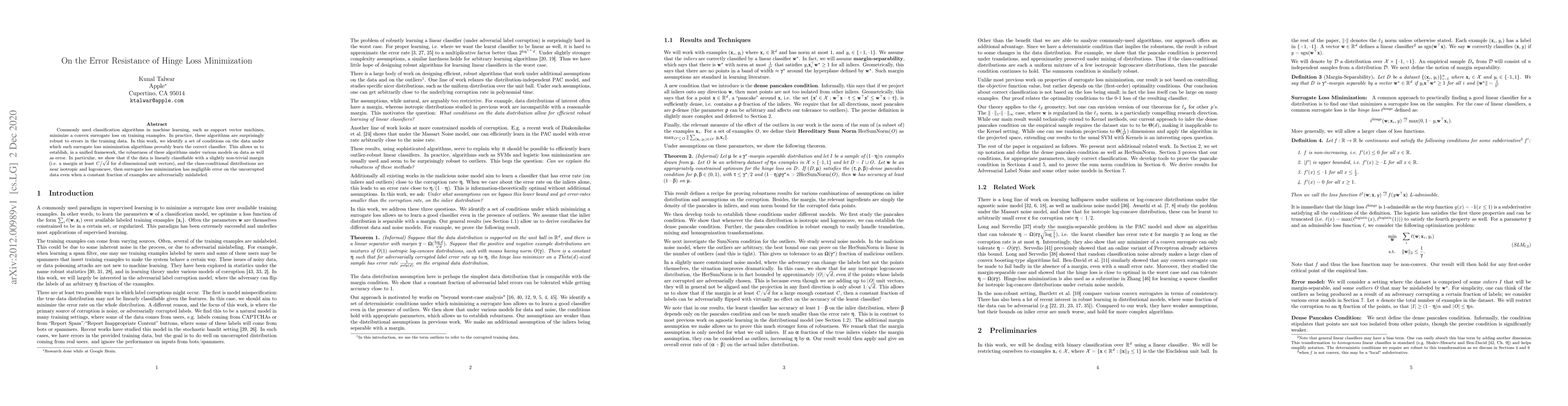 Commonly used classification algorithms in machine learning, such as support vector machines, minimize a convex surrogate loss on training examples. In practice, these algorithms are surprisingly robust to errors in the training data. In this work, we identify a set of conditions on the data under which such surrogate loss minimization algorithms provably learn the correct classifier. This allows us to establish, in a unified framework, the robustness of these algorithms under various models on data as well as error. In particular, we show that if the data is linearly classifiable with a slightly non-trivial margin (i.e. a margin at least $C/\sqrt{d}$ for $d$-dimensional unit vectors), and the class-conditional distributions are near isotropic and logconcave, then surrogate loss minimization has negligible error on the uncorrupted data even when a constant fraction of examples are adversarially mislabeled.