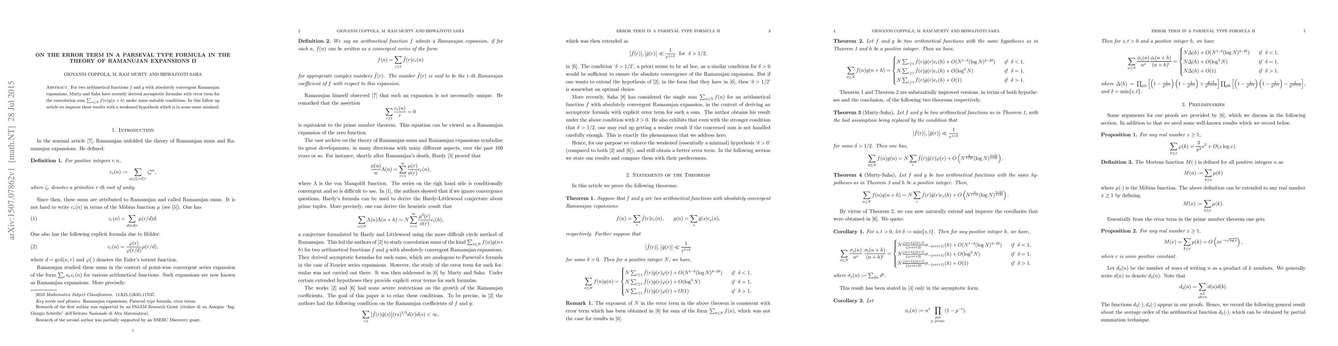 For two arithmetical functions $f$ and $g$ with absolutely convergent Ramanujan expansions, Murty and Saha have recently derived asymptotic formulas with error term for the convolution sum $\sum_{n \le N} f(n) g(n+h)$ under some suitable conditions (see http://arxiv.org/abs/1506.01945). In this follow up article we improve these results with a weakened hypothesis which is in some sense minimal.