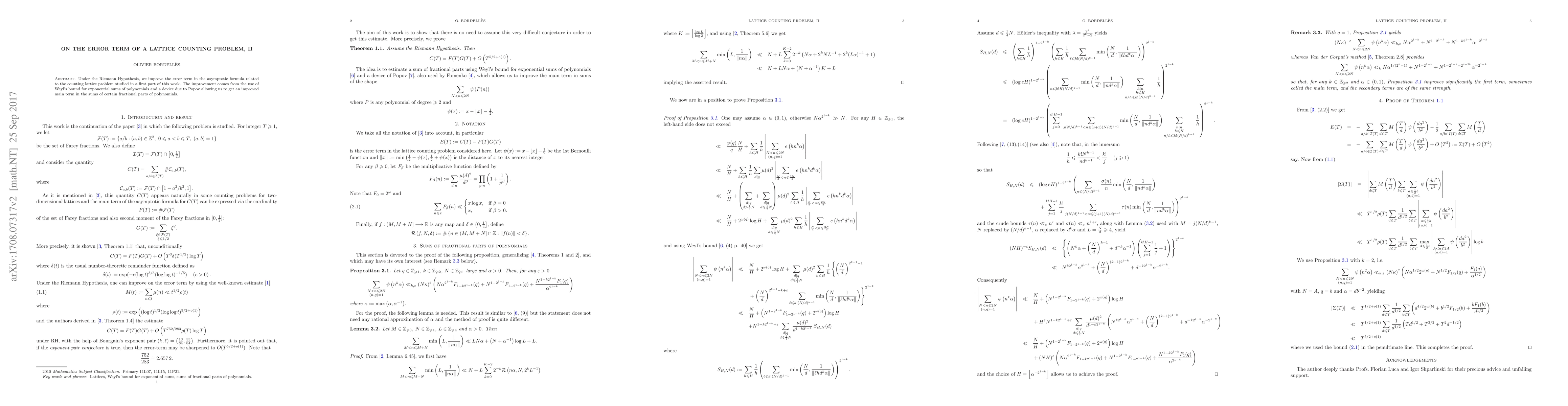 This paper enhances the error term in the asymptotic formula for a lattice counting problem under the Riemann Hypothesis, leveraging Weyl's bound for exponential sums and Popov's method to refine the main term in sums involving fractional parts of polynomials.