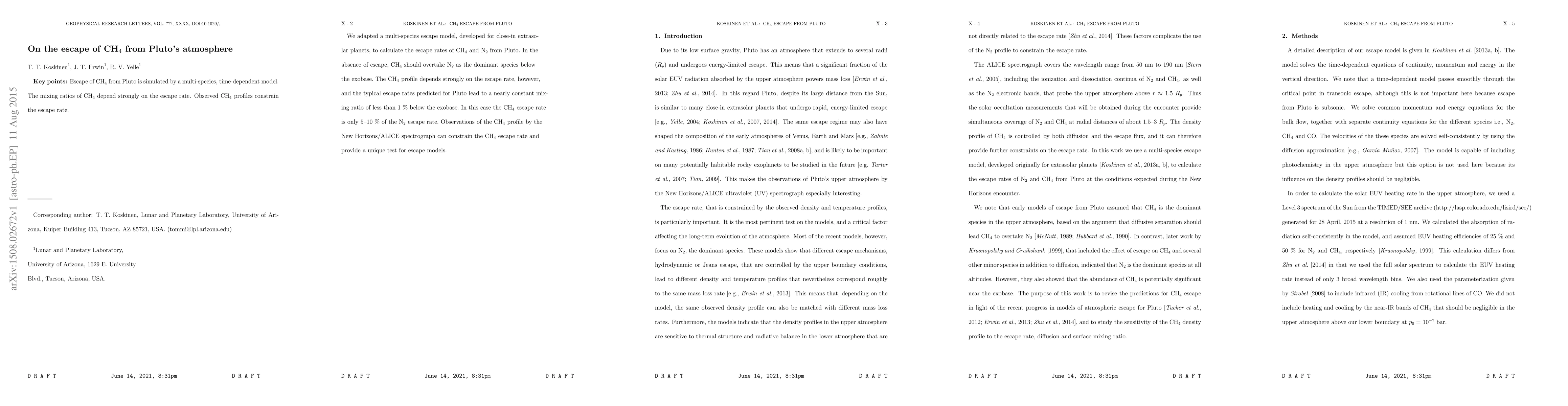 Researchers used a model to calculate how much methane (CH4) escapes from Pluto's atmosphere, finding that the escape rate is only 5-10% of nitrogen's (N2), contradicting previous predictions.