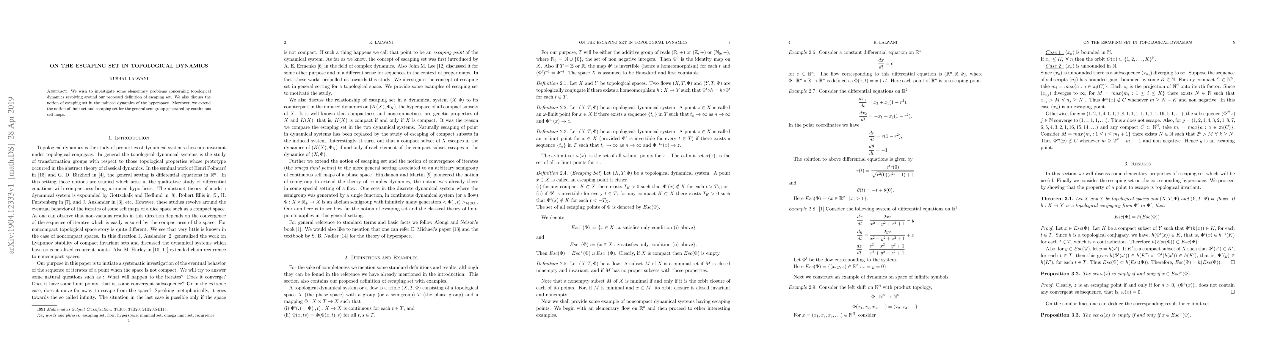 We wish to investigate some elementary problems concerning topological dynamics revolving around our proposed definition of escaping set. We also discuss the notion of escaping set in the induced dynamics of the hyperspace. Moreover, we extend the notion of limit set and escaping set for the general semigroup generated by continuous self maps.