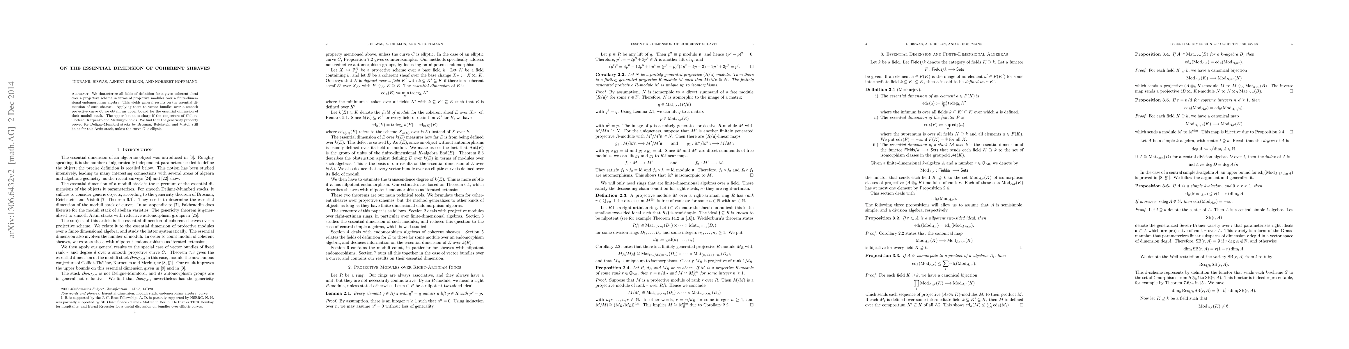Summary: The paper characterizes fields of definition for coherent sheaves in terms of projective modules, providing general results on their essential dimension. It finds an upper bound for the essential dimension of vector bundles over smooth projective curves, which is sharp under a conjecture, and verifies the genericity property for the Artin stack unless the curve is elliptic.