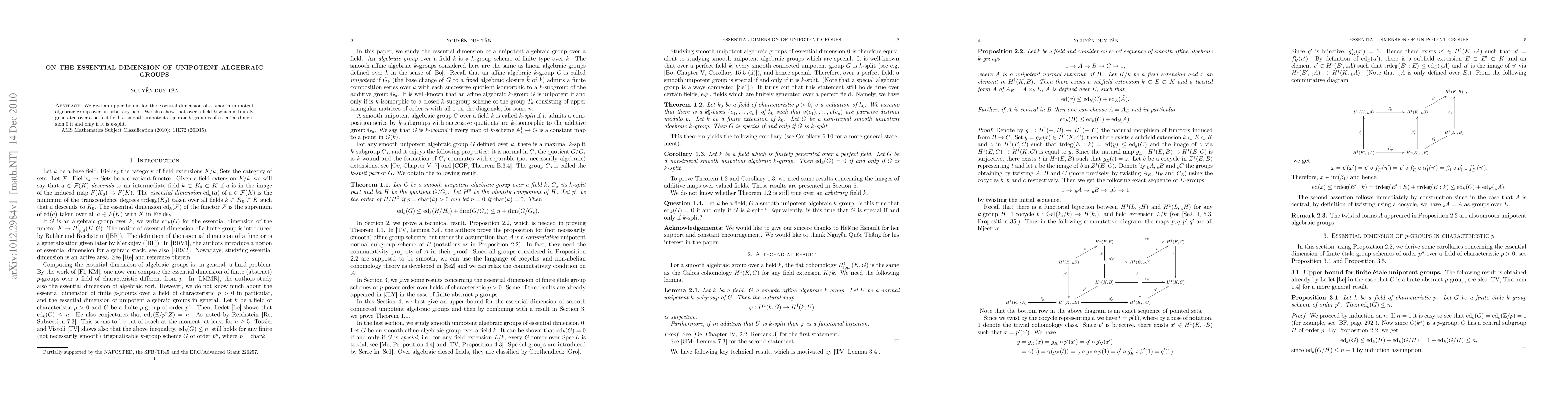 Researchers found that the essential dimension of smooth unipotent algebraic groups over fields can be bounded, with certain groups being of dimension 0 if they are k-split, where k is a finitely generated field over a perfect one.