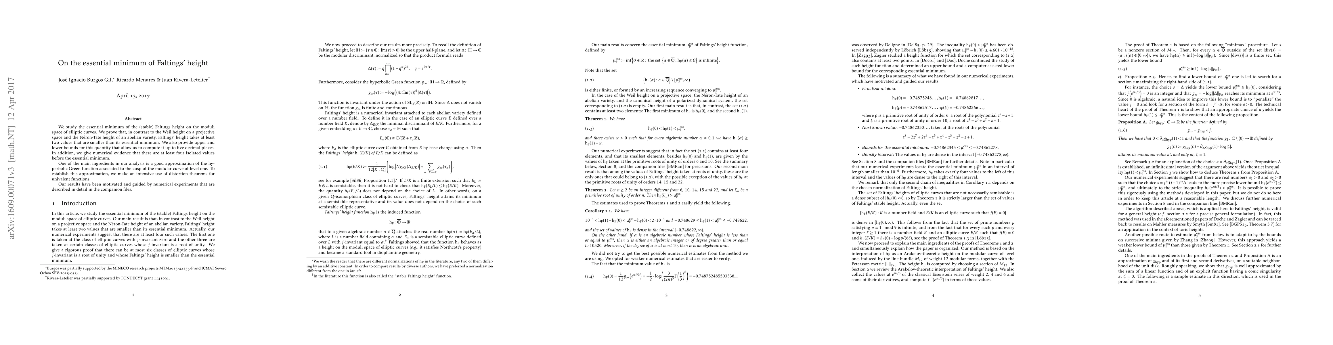 This paper investigates the essential minimum of Faltings' height on the moduli space of elliptic curves, proving that it takes at least two values below its essential minimum. The authors provide upper and lower bounds for this quantity and suggest there are at least four isolated values before the essential minimum, supported by numerical experiments and approximations of the hyperbolic Green function.