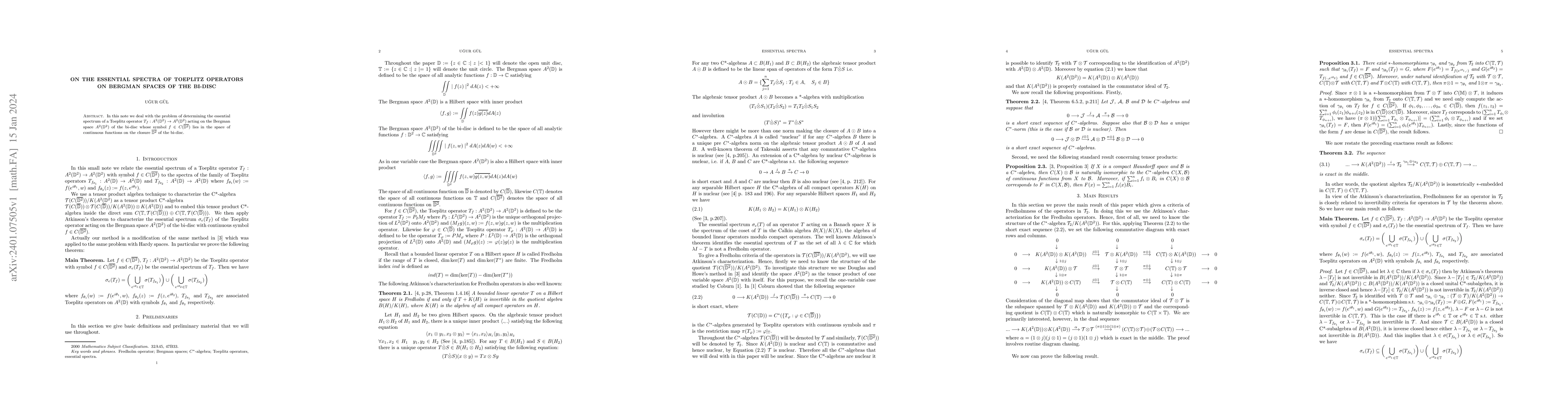 This paper investigates the essential spectrum of Toeplitz operators $T_{f}$ on the Bergman space $A^{2}(\mathbb{D}^{2})$ of the bi-disc, where the symbol $f$ is a continuous function on the closure $\overline{\mathbb{D}^{2}}$. The study aims to determine the essential spectral properties of these operators.