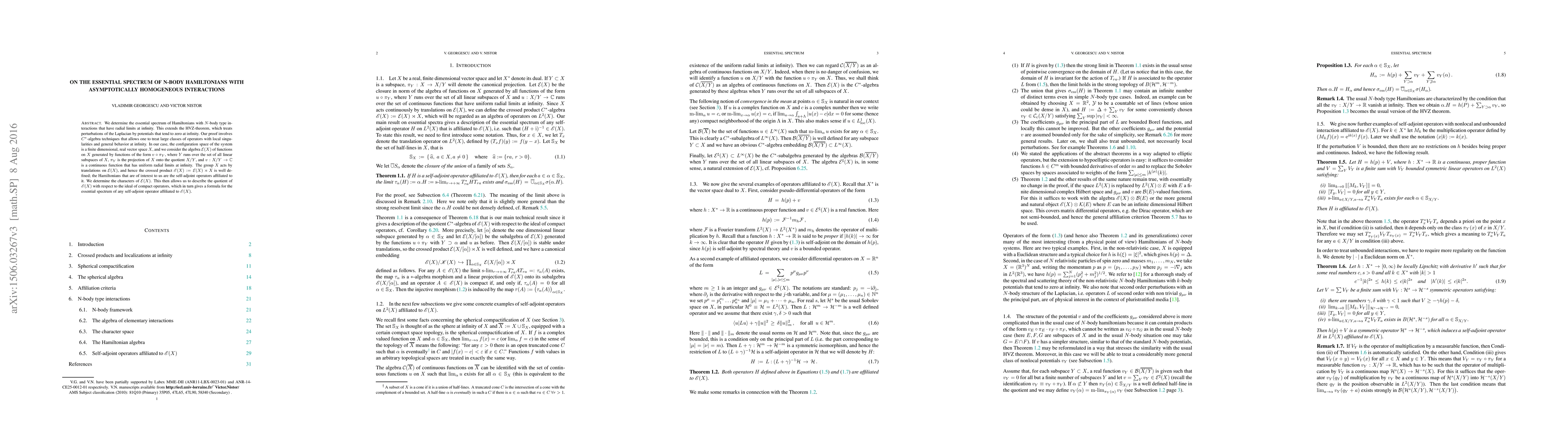 We determine the essential spectrum of Hamiltonians with N-body type interactions that have radial limits at infinity. This extends the HVZ-theorem, which treats perturbations of the Laplacian by potentials that tend to zero at infinity. Our proof involves $C^*$-algebra techniques that allows one to treat large classes of operators with local singularities and general behavior at infinity. In our case, the configuration space of the system is a finite dimensional, real vector space $X$, and we consider the $C^*$-algebra $\mathcal{E}(X)$ of functions on $X$ generated by functions of the form $v\circ\pi_Y$, where $Y$ runs over the set of all linear subspaces of $X$, $\pi_Y$ is the projection of $X$ onto the quotient $X/Y$, and $v:X/Y\to\mathbb{C}$ is a continuous function that has uniform radial limits at infinity. The group $X$ acts by translations on $\mathcal{E}(X)$, and hence the crossed product $\mathscr{E}(X) := \mathcal{E}(X)\rtimes X$ is well defined; the Hamiltonians that are of interest to us are the self-adjoint operators affiliated to it. We determine the characters of $\mathcal{E}(X)$. This then allows us to describe the quotient of $\mathscr{E}(X)$ with respect to the ideal of compact operators, which in turn gives a formula for the essential spectrum of any self-adjoint operator affiliated to $\mathscr(X)$.