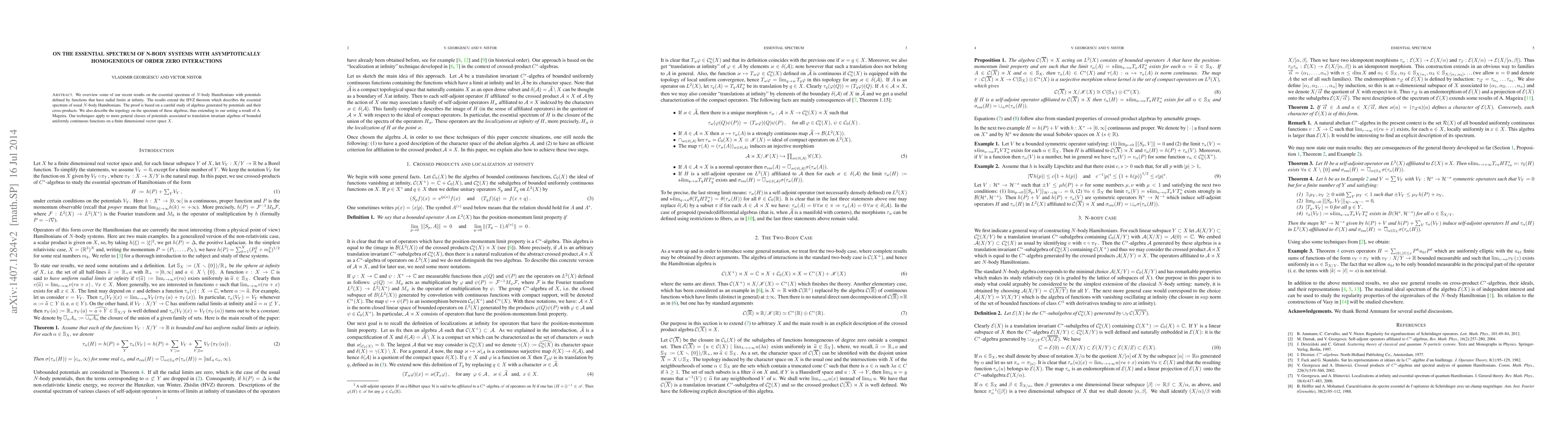 We overview some of our recent results on the essential spectrum of N-body Hamiltonians with potentials defined by functions that have radial limits at infinity. The results extend the HVZ theorem which describes the essential spectrum of usual N-body Hamiltonians. The proof is based on a careful study of algebras generated by potentials and their cross-products. We also describe the topology on the spectrum of these algebras, thus extending to our setting a result of A. Mageira. Our techniques apply to more general classes of potentials associated to translation invariant algebras of bounded uniformly continuous functions on a finite dimensional vector space.
