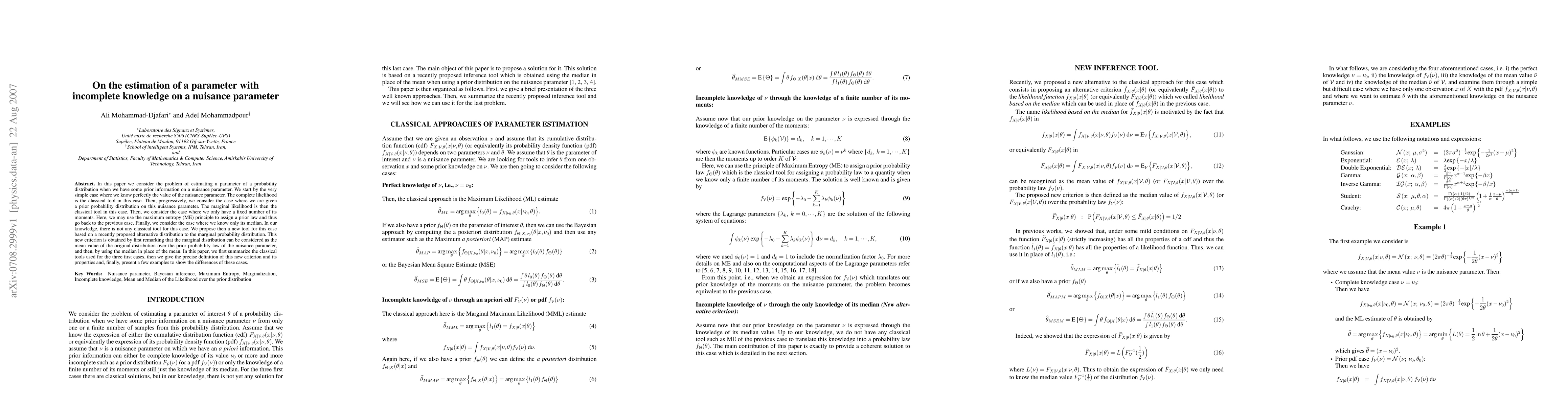 In this paper we consider the problem of estimating a parameter of a probability distribution when we have some prior information on a nuisance parameter. We start by the very simple case where we know perfectly the value of the nuisance parameter. The complete likelihood is the classical tool in this case. Then, progressively, we consider the case where we are given a prior probability distribution on this nuisance parameter. The marginal likelihood is then the classical tool in this case. Then, we consider the case where we only have a fixed number of its moments. Here, we may use the maximum entropy (ME) principle to assign a prior law and thus go back to the previous case. Finally, we consider the case where we know only its median. In our knowledge, there is not any classical tool for this case. We propose then a new tool for this case based on a recently proposed alternative distribution to the marginal probability distribution. This new criterion is obtained by first remarking that the marginal distribution can be considered as the mean value of the original distribution over the prior probability law of the nuisance parameter, and then, by using the median in place of the mean. In this paper, we first summarize the classical tools used for the three first cases, then we give the precise definition of this new criterion and its properties and, finally, present a few examples to show the differences of these cases. Key Words: Nuisance parameter, Bayesian inference, Maximum Entropy, Marginalization, Incomplete knowledge, Mean and Median of the Likelihood over the prior distribution