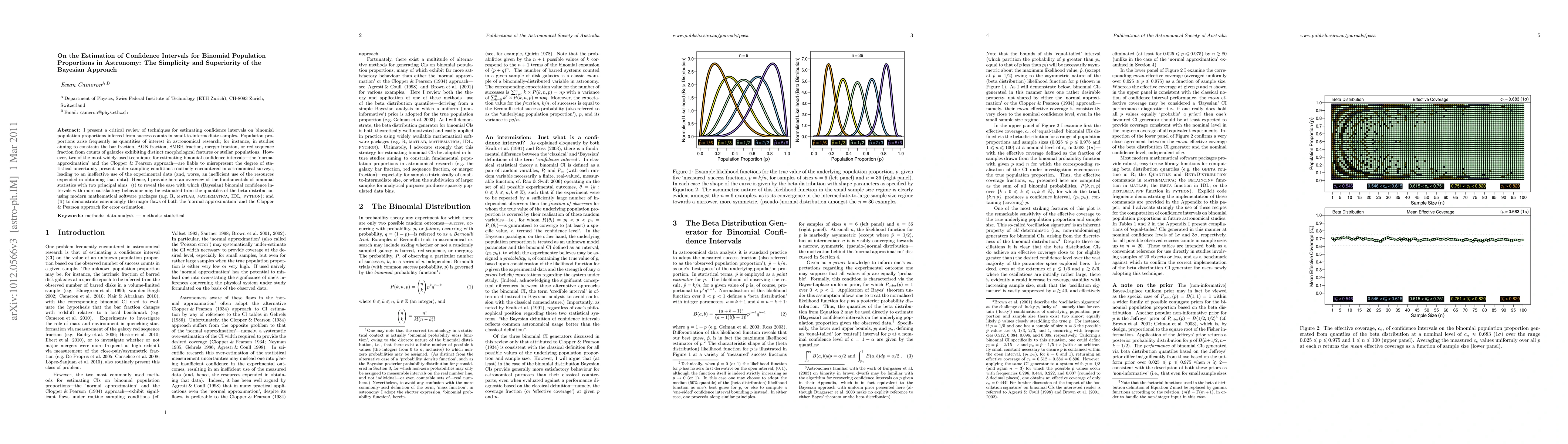 This paper reviews methods for estimating confidence intervals for binomial population proportions in astronomy, highlighting the limitations of traditional approaches like the normal approximation and the Clopper & Pearson method. It advocates for the Bayesian approach, which is simpler and more accurate, using the beta distribution to derive better confidence intervals.