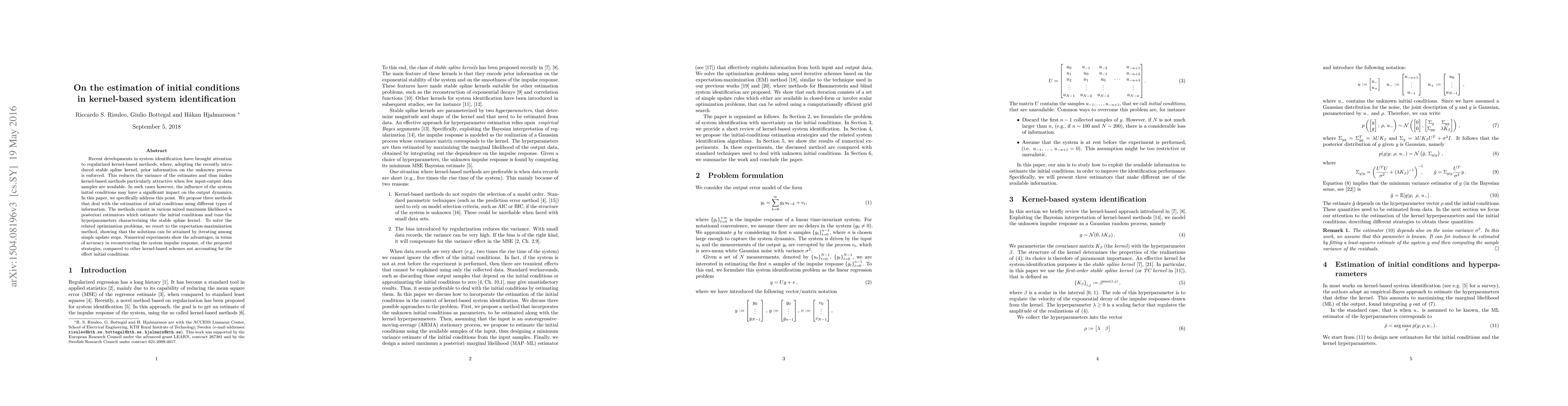 Recent developments in system identification have brought attention to regularized kernel-based methods, where, adopting the recently introduced stable spline kernel, prior information on the unknown process is enforced. This reduces the variance of the estimates and thus makes kernel-based methods particularly attractive when few input-output data samples are available. In such cases however, the influence of the system initial conditions may have a significant impact on the output dynamics. In this paper, we specifically address this point. We propose three methods that deal with the estimation of initial conditions using different types of information. The methods consist in various mixed maximum likelihood--a posteriori estimators which estimate the initial conditions and tune the hyperparameters characterizing the stable spline kernel. To solve the related optimization problems, we resort to the expectation-maximization method, showing that the solutions can be attained by iterating among simple update steps. Numerical experiments show the advantages, in terms of accuracy in reconstructing the system impulse response, of the proposed strategies, compared to other kernel-based schemes not accounting for the effect initial conditions.