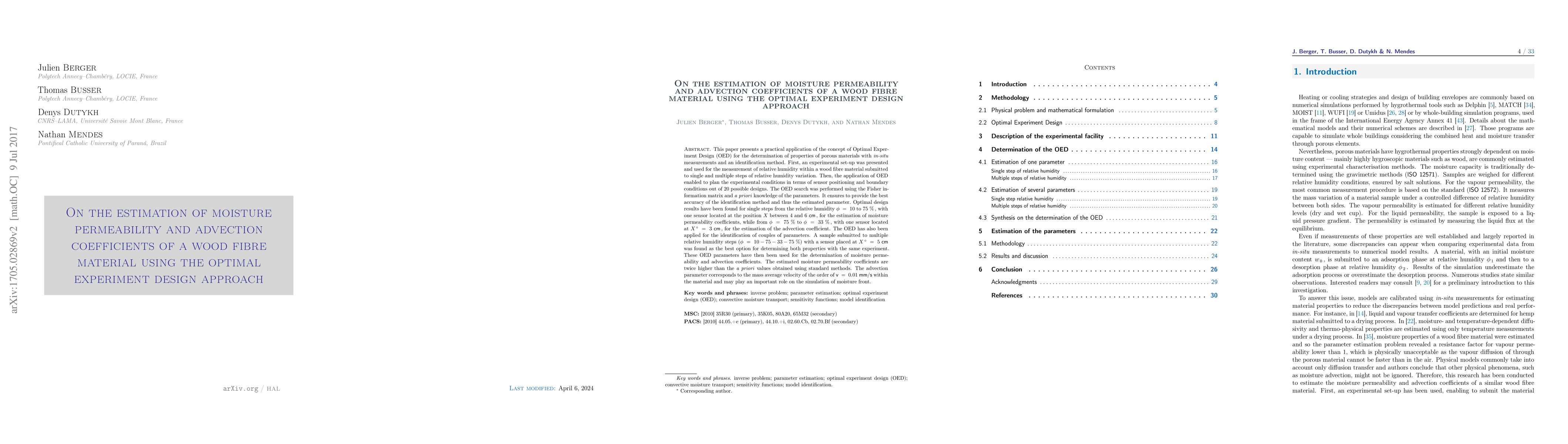 This paper employs Optimal Experiment Design (OED) to determine moisture permeability and advection coefficients in wood fibre material using in-situ relative humidity measurements. The OED approach optimizes sensor placement and conditions, resulting in improved accuracy and higher permeability estimates compared to standard methods.