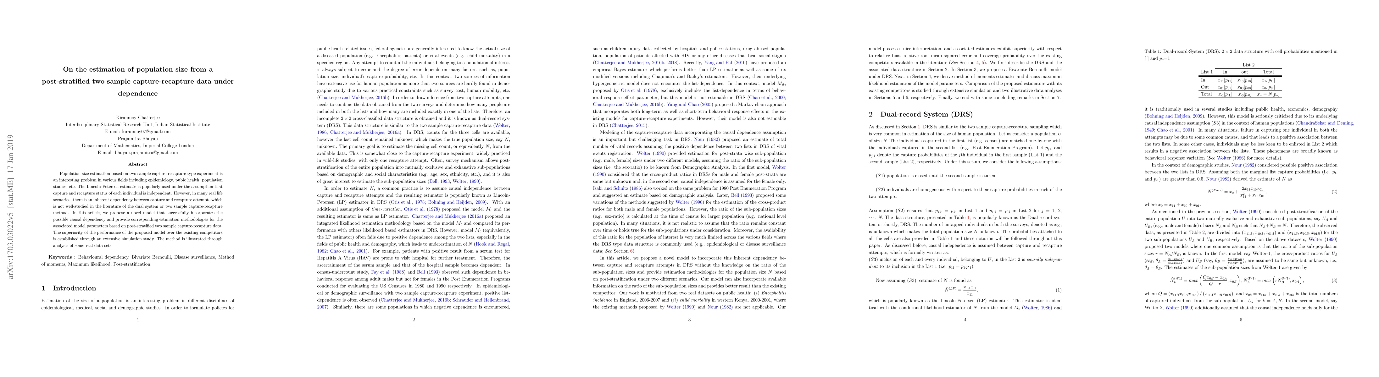 This paper proposes a novel model to estimate population size from post-stratified two sample capture-recapture data, addressing the dependency between capture and recapture attempts. The new model's effectiveness is demonstrated through simulations and real data analysis, showing superior performance compared to existing methods.