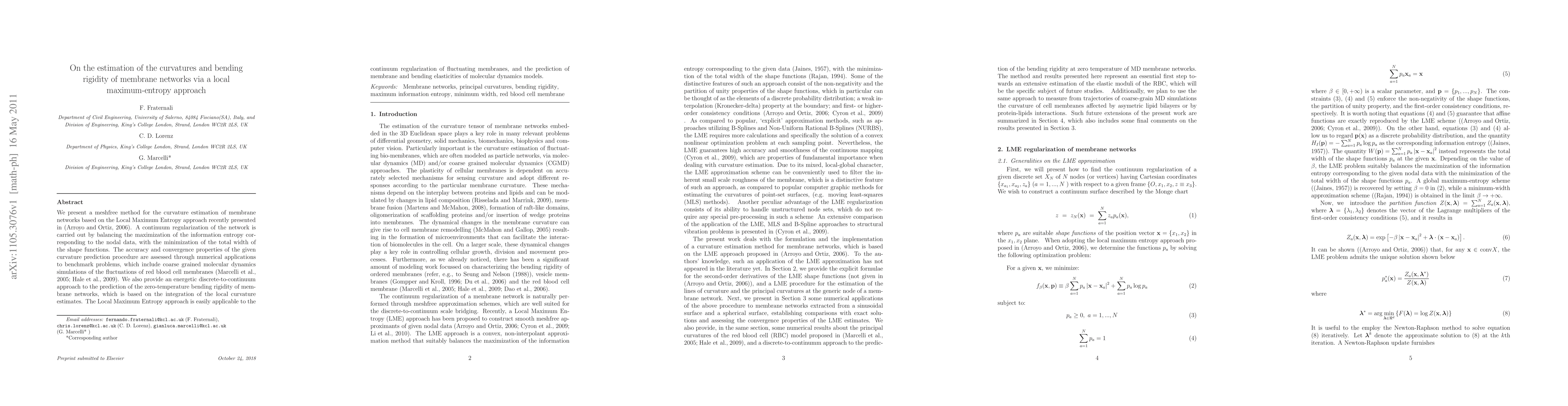 We present a meshfree method for the curvature estimation of membrane networks based on the Local Maximum Entropy approach recently presented in (Arroyo and Ortiz, 2006). A continuum regularization of the network is carried out by balancing the maximization of the information entropy corresponding to the nodal data, with the minimization of the total width of the shape functions. The accuracy and convergence properties of the given curvature prediction procedure are assessed through numerical applications to benchmark problems, which include coarse grained molecular dynamics simulations of the fluctuations of red blood cell membranes (Marcelli et al., 2005; Hale et al., 2009). We also provide an energetic discrete-to-continuum approach to the prediction of the zero-temperature bending rigidity of membrane networks, which is based on the integration of the local curvature estimates. The Local Maximum Entropy approach is easily applicable to the continuum regularization of fluctuating membranes, and the prediction of membrane and bending elasticities of molecular dynamics models.