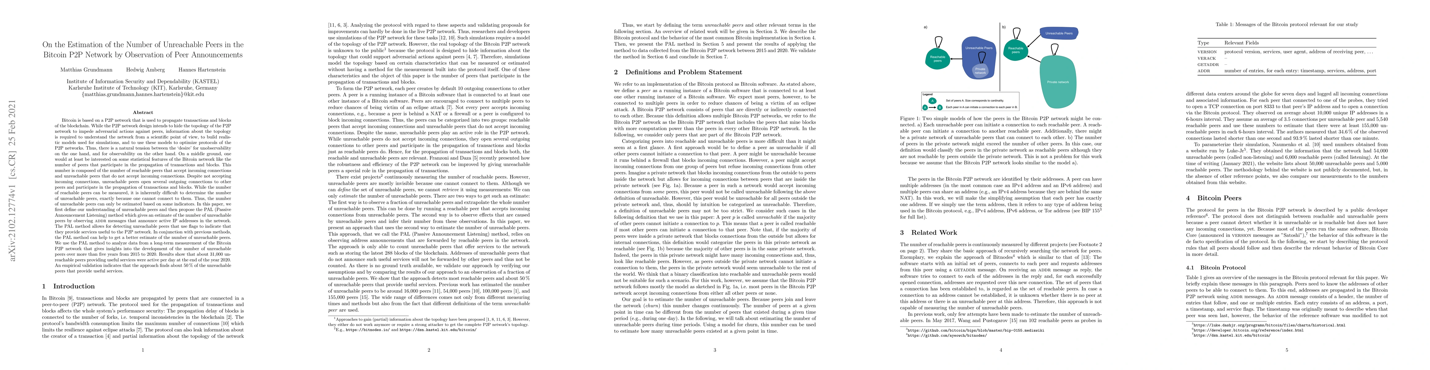 This paper proposes the PAL method to estimate the number of unreachable peers in the Bitcoin P2P network by analyzing ADDR messages. It finds that around 31,000 unreachable peers providing useful services were active daily by the end of 2020, with the method showing an empirical validation of detecting about 50% of such peers.