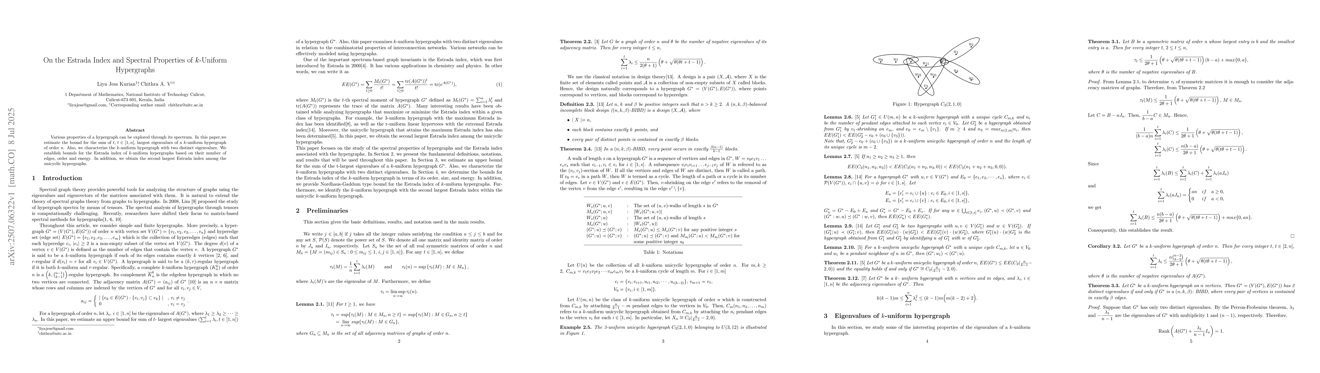 Various properties of a hypergraph can be explored through its spectrum. In this paper,we estimate the bound for the sum of $t,\,t\in[1,n]$, largest eigenvalues of a $k$-uniform hypergraph of order $n$. Also, we characterize the $k$-uniform hypergraph with two distinct eigenvalues. We establish bounds for the Estrada index of $k$-uniform hypergraphs based on their number of edges, order and energy. In addition, we obtain the second largest Estrada index among the unicyclic hypergraphs.