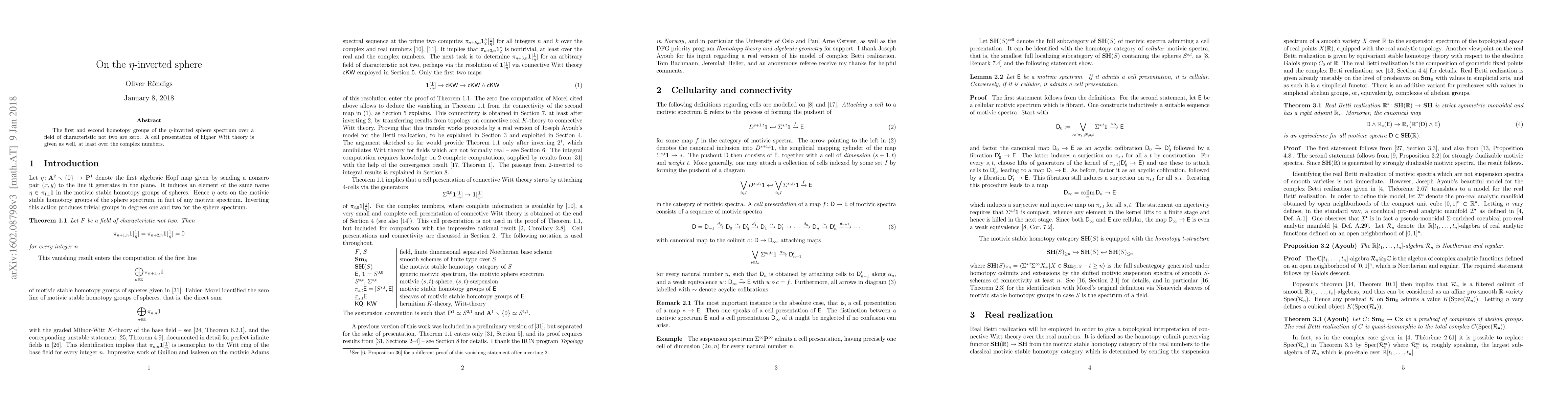 It is shown that the first and second homotopy groups of the $\eta$-inverted sphere spectrum over a field of characteristic not two are zero. A cell presentation of higher Witt theory is given as well, at least over the complex numbers.