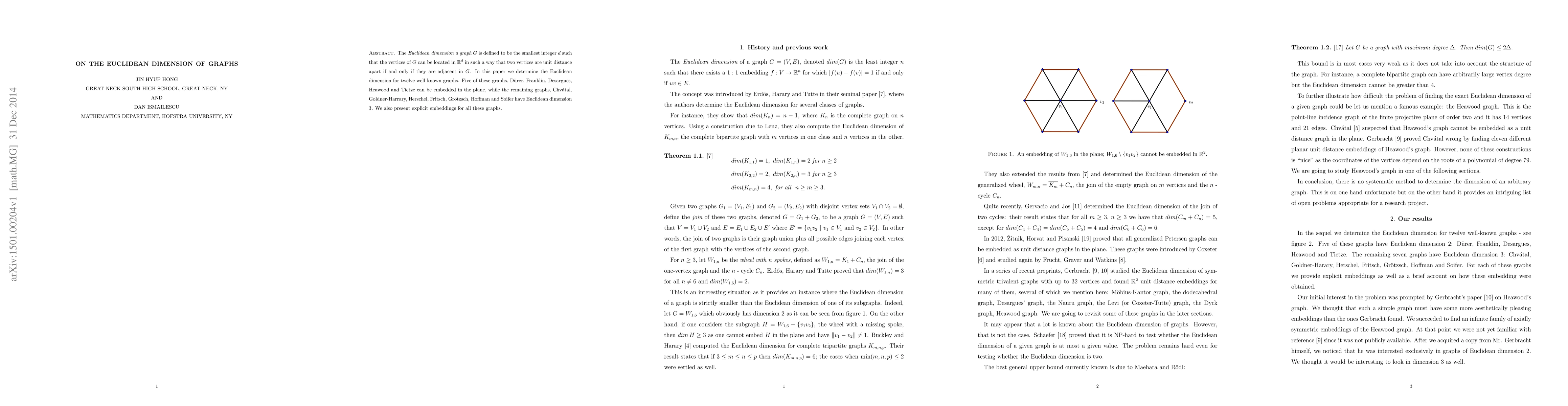 The Euclidean dimension a graph $G$ is defined to be the smallest integer $d$ such that the vertices of $G$ can be located in $\mathbb{R}^d$ in such a way that two vertices are unit distance apart if and only if they are adjacent in $G$. In this paper we determine the Euclidean dimension for twelve well known graphs. Five of these graphs, D\"{u}rer, Franklin, Desargues, Heawood and Tietze can be embedded in the plane, while the remaining graphs, Chv\'{a}tal, Goldner-Harrary, Herschel, Fritsch, Gr\"{o}tzsch, Hoffman and Soifer have Euclidean dimension $3$. We also present explicit embeddings for all these graphs.