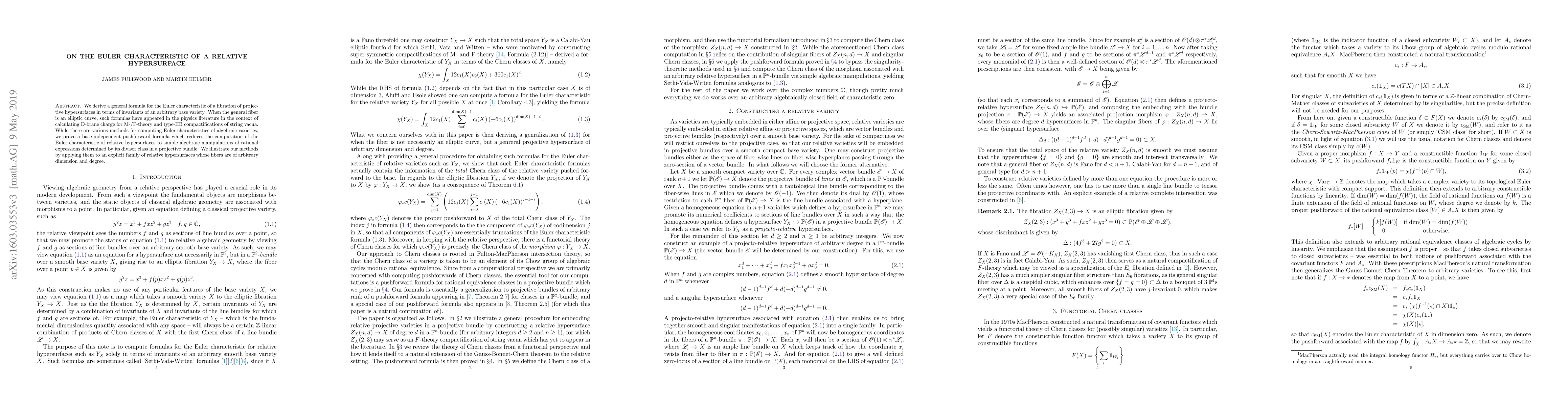 We derive a general formula for the Euler characteristic of a fibration of projective hypersurfaces in terms of invariants of an arbitrary base variety. When the general fiber is an elliptic curve, such formulas have appeared in the physics literature in the context of calculating D-brane charge for M-/F-theory and type-IIB compactifications of string vacua. While there are various methods for computing Euler characteristics of algebraic varieties, we prove a base-independent pushforward formula which reduces the computation of the Euler characteristic of relative hypersurfaces to simple algebraic manipulations of rational expressions determined by its divisor class in a projective bundle. We illustrate our methods by applying them to an explicit family of relative hypersurfaces whose fibers are of arbitrary dimension and degree.