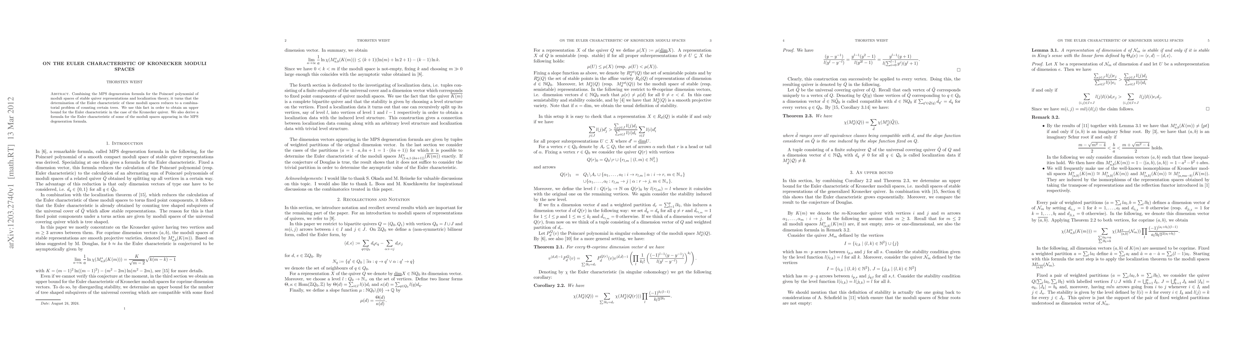 The paper derives an upper bound for the Euler characteristic of Kronecker moduli spaces by reducing the problem to a combinatorial counting of certain trees, leveraging the MPS degeneration formula and localization theory. It also provides a formula for the Euler characteristic of specific moduli spaces in the MPS degeneration formula.