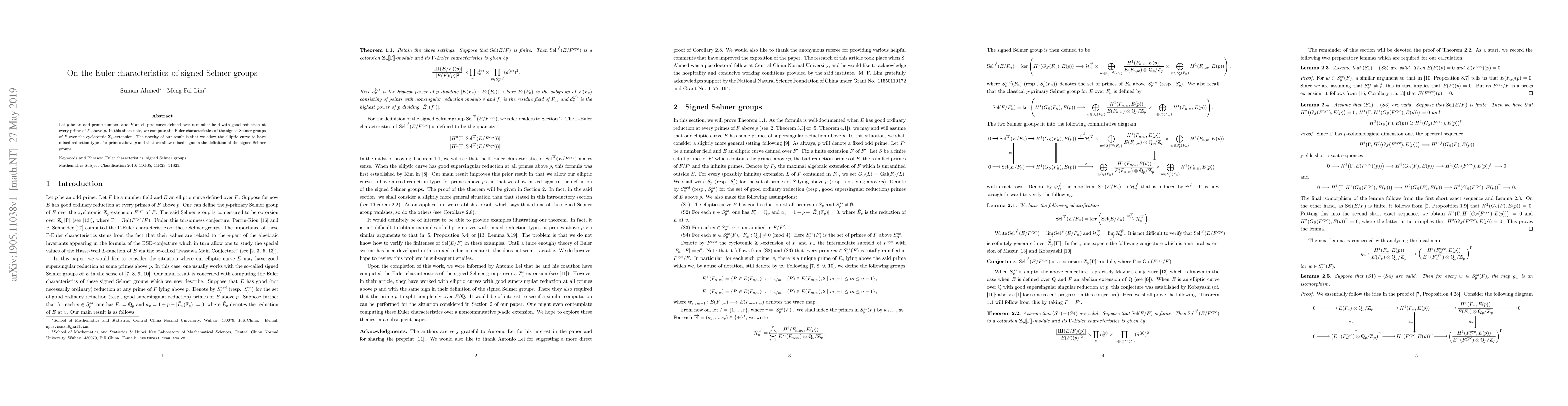This paper computes Euler characteristics of signed Selmer groups for elliptic curves defined over number fields, allowing for mixed reduction types above an odd prime $p$ and mixed signs in the groups, offering a novel perspective on their behavior in cyclotomic $\Zp$-extensions.
