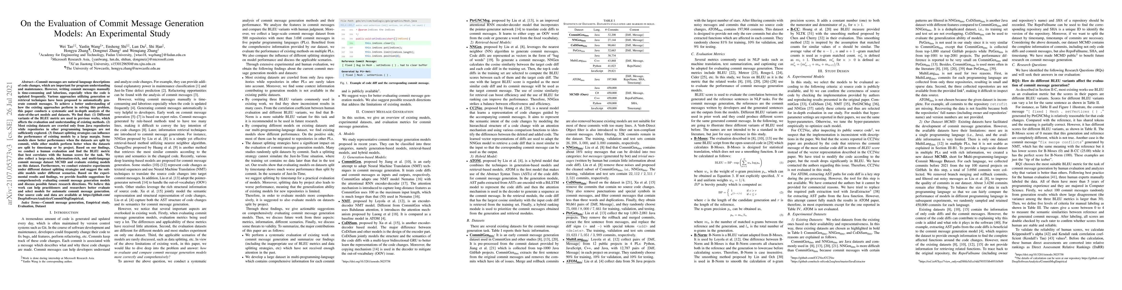 This paper evaluates state-of-the-art models for automatic commit message generation, highlighting issues with existing evaluation metrics and dataset biases. It proposes a new multi-language dataset and suggests optimal models for different dataset splitting strategies, offering guidelines for future research in this area.