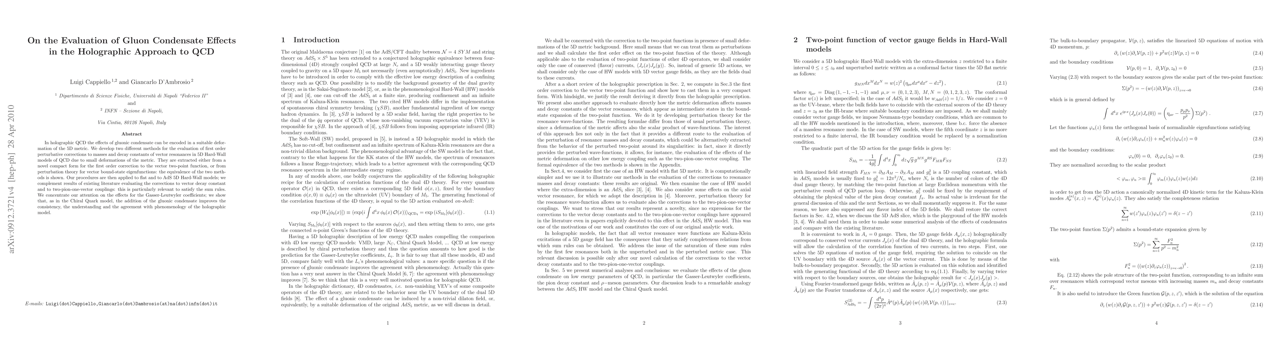 In holographic QCD the effects of gluonic condensate can be encoded in a suitable deformation of the 5D metric. We develop two different methods for the evaluation of first order perturbative corrections to masses and decay constants of vector resonances in 5D Hard-Wall models of QCD due to small deformations of the metric. They are extracted either from a novel compact form for the first order correction to the vector two-point function, or from perturbation theory for vector bound-state eigenfunctions: the equivalence of the two methods is shown. Our procedures are then applied to flat and to AdS 5D Hard-Wall models; we complement results of existing literature evaluating the corrections to vector decay constant and to two-pion-one-vector couplings: this is particularly relevant to satisfy the sum rules. We concentrate our attention on the effects for the Gasser-Leutwyler coefficients; we show that, as in the Chiral Quark model, the addition of the gluonic condensate improves the consistency, the understanding and the agreement with phenomenology of the holographic model.