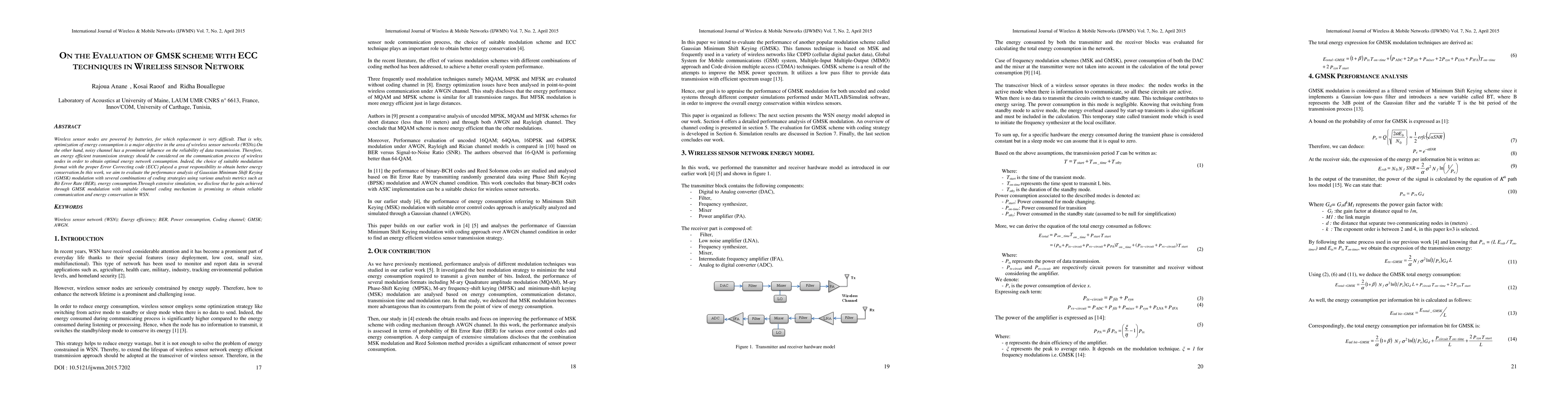 This paper evaluates the performance of Gaussian Minimum Shift Keying (GMSK) modulation combined with various Error Correcting Codes (ECC) in wireless sensor networks, focusing on energy efficiency and reliability. Simulation results show that GMSK with appropriate ECC strategies significantly enhances both communication reliability and energy conservation.